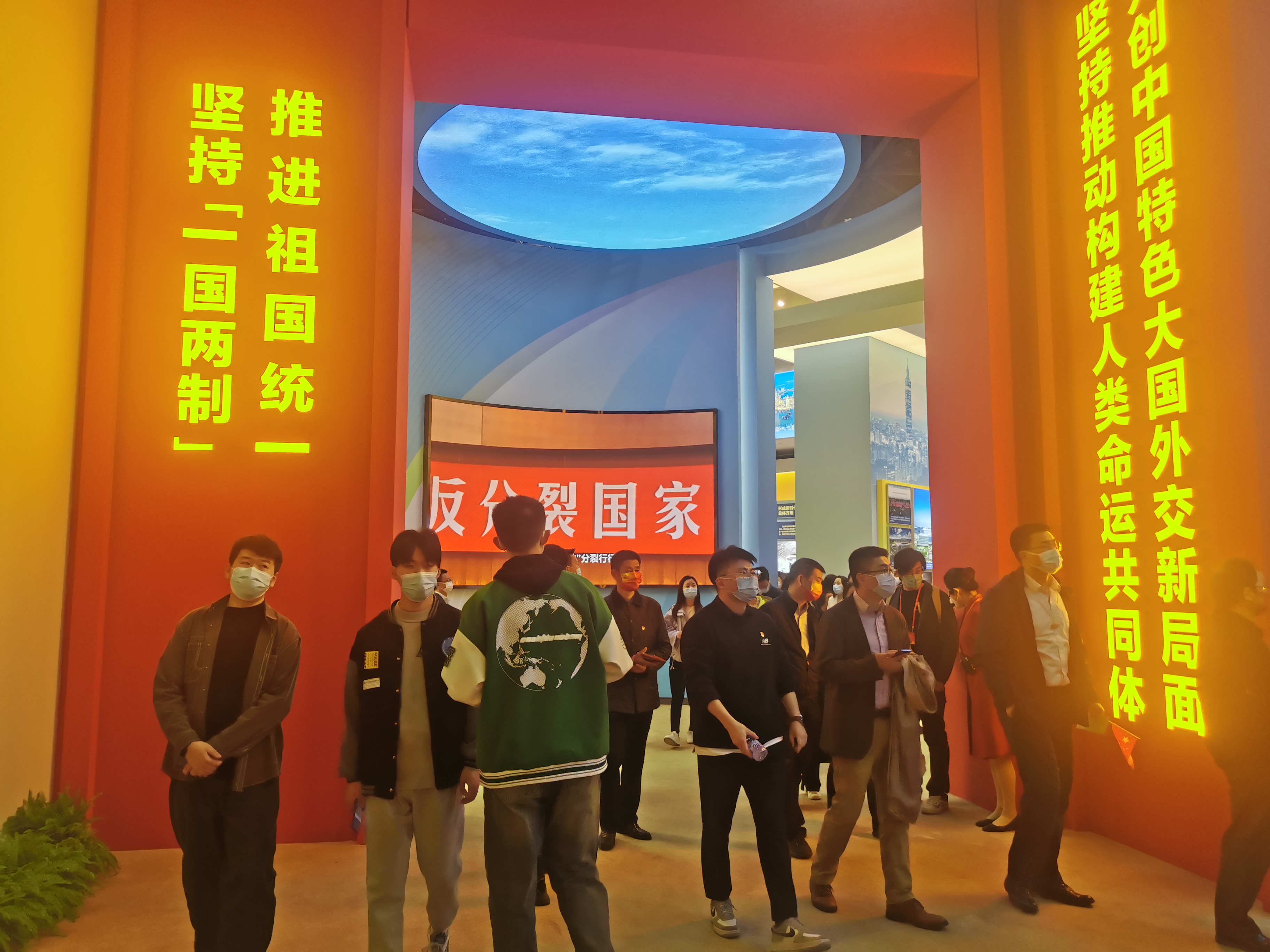展覽現場展示了2017年6月29日和今年6月30日,中共中央總書記、國家主席、中央軍委主席習近平分別乘專機、專列抵達香港,出席慶祝香港回歸祖國20周年和25周年大會並視察香港的照片。堅持中央全面管治權和保障特別行政區高度自治權相統一,2017年12月,全國人大常委會批准了在廣深港高鐵西九龍站設立口岸實施「一地兩檢」的合作安排,展覽中一張廣深港高鐵西九龍站照片,充分展示尊重和維護了特別行政區的高度自治權。另一張從2022年1月開始香港特別行政區立法會會議廳懸掛國徽的照片,則展示了「一國兩制」方針是一個完整的體系,維護國家主權、安全、發展利益是「一國兩制」方針的最高原則。