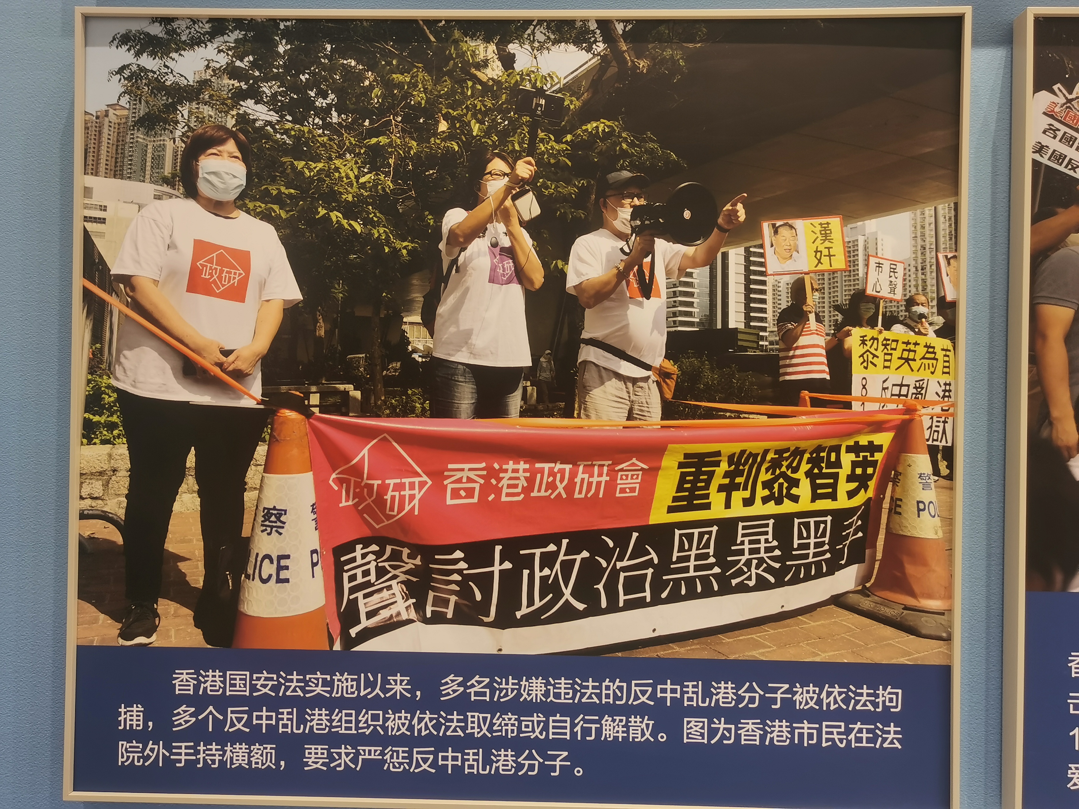 2020年6月30日,全國人大常委會通過香港國安法,並決定將該法列入基本法附件三,由香港特別行政區政府同日刊憲公布實施。一張香港市民在法院外手持橫額,要求嚴懲反中亂港分子的照片,則展示出香港國安法實施以來,多名涉嫌違法的反中亂港分子被依法拘捕,多個反中亂港組織已被依法取締或自行解散,有力打擊了「港獨」激進勢力的囂張氣焰。