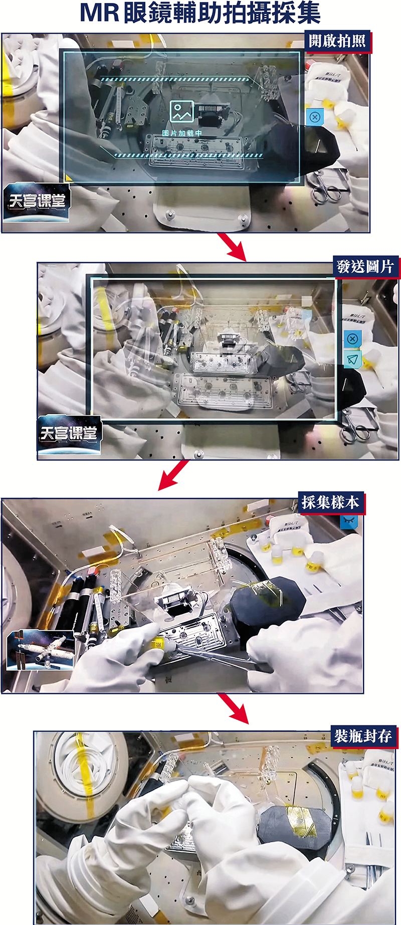 在本次太空授課中,陳冬直播演示採集擬南芥標本的全過程。「小南」首先轉移到科學手套箱中。陳冬佩戴上助力實驗的MR眼鏡,通過眼鏡的視野,地面上的人們也可以清晰看到手套箱內的一舉一動。陳冬通過語音控制MR眼鏡拍攝擬南芥的圖片並傳回地面。他小心地拿出剪刀採集樣品,並將其裝入凍存管中,待返回地球時將它們交給科學家研究。「非常期待能夠在太空站收穫我們自己種植的糧食,說不定在不久的將來,在月球甚至在火星我們都能實現袁隆平院士的禾下乘涼夢。」陳冬說。