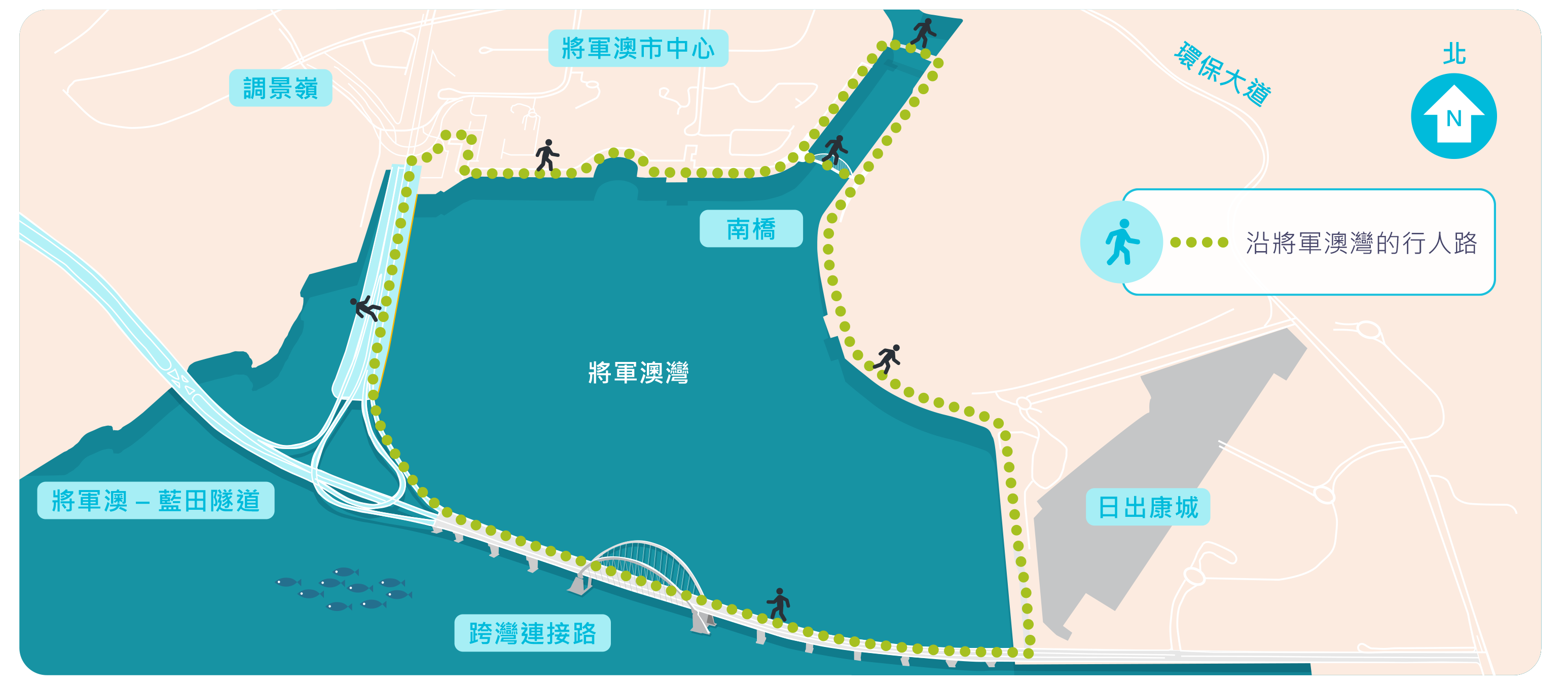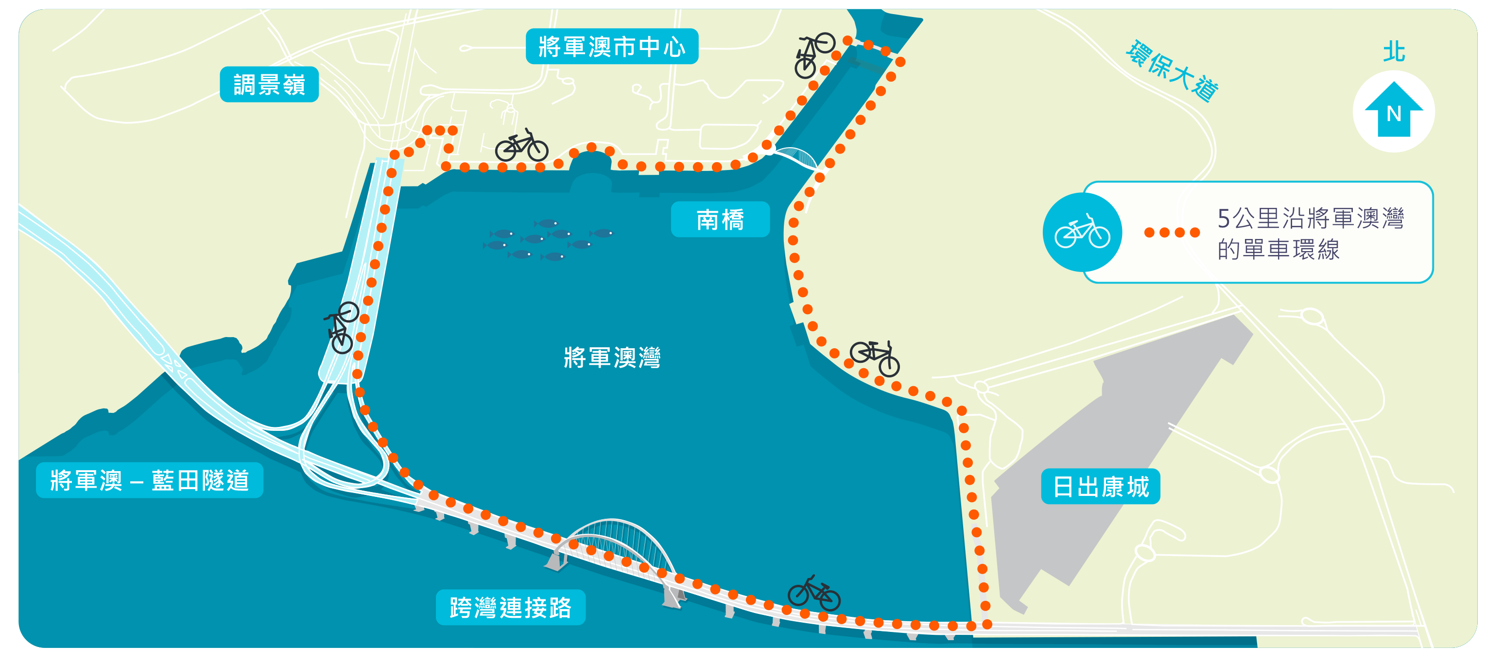 將軍澳跨灣大橋落成後,將成為全港首條同時設有行車道、行人路、單車徑及觀景台的跨灣大橋,全長約1.8公里長,而大橋上的單車徑將與沿將軍澳灣的單車徑連接組成5公里長的沿海單車徑,將軍澳跨灣大橋或成為全新踩單車好去處。
