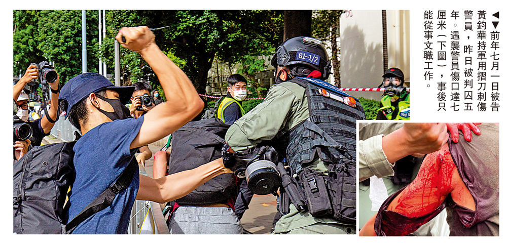 (大公報記者 龔學鳴)前年7月1日港島爆發非法示威,一名防暴警員在皇仁書院外執勤時,遭一名男暴徒以軍用摺刀刺傷,該暴徒當晚在即將起飛往英國倫敦的航班上被捕,被控有意圖傷人及暴動罪。案件昨日在區域法院判刑,刺警暴徒被判囚五年,同案另一被告承認暴動及阻差辦公罪,被判囚33個月。