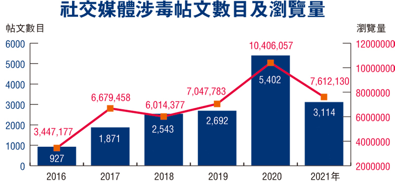 青協青年違法防治中心的抗毒服務由2016年開始運用人工智能及大數據,分析本地毒品問題和趨勢。根據昨日公布的最新調查結果發現,香港關於毒品的社交媒體帖文,由2016年的927篇上升至去年的3,114篇,較5年前升逾2.3倍。瀏覽量則由2016年約350萬人次,上升至去年的超過761萬次。其中以2020年為高峰,帖文多達5,402篇,瀏覽量超過1,000萬次(見表)。
