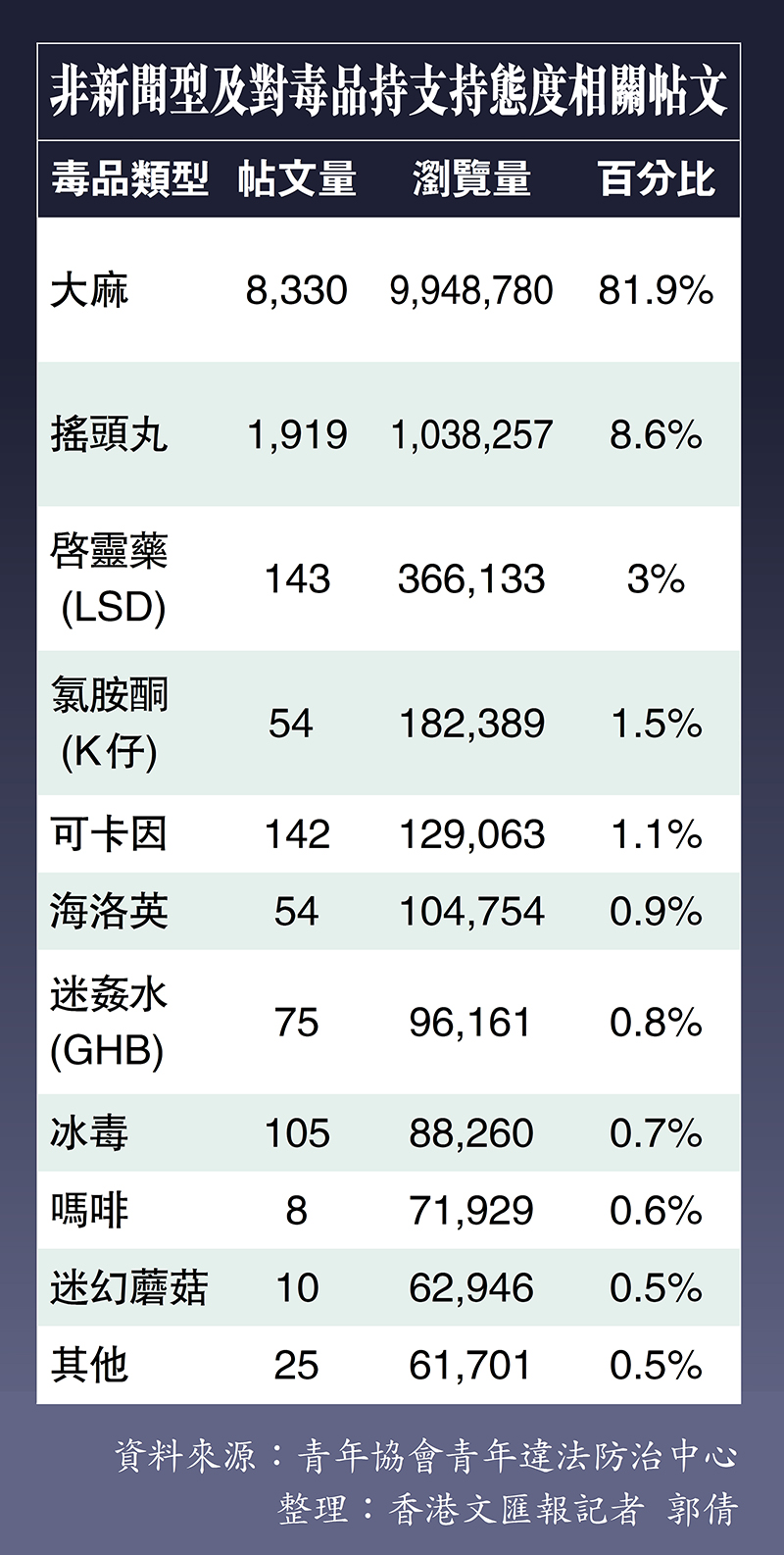 按照非新聞類型和對毒品支持態度計算,最多帖文與大麻、搖頭丸、啟靈藥(LSD)、氯胺酮(K仔)和可卡因相關,而深入研究2021年的相關提問,估計他們吸毒的主要原因包括尋求刺激感(44%)、擺脫負面情緒(38%),以及低估吸毒的嚴重性(15%)。