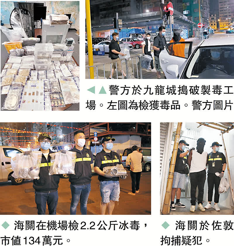 警方及海關近日先後分別在九龍城和機場破獲一個製毒工場,以及齒輪藏毒案,檢獲毒品包括大麻草、大麻油、「毒郵票」及冰毒等共值534萬元。兩名男子被捕扣查。