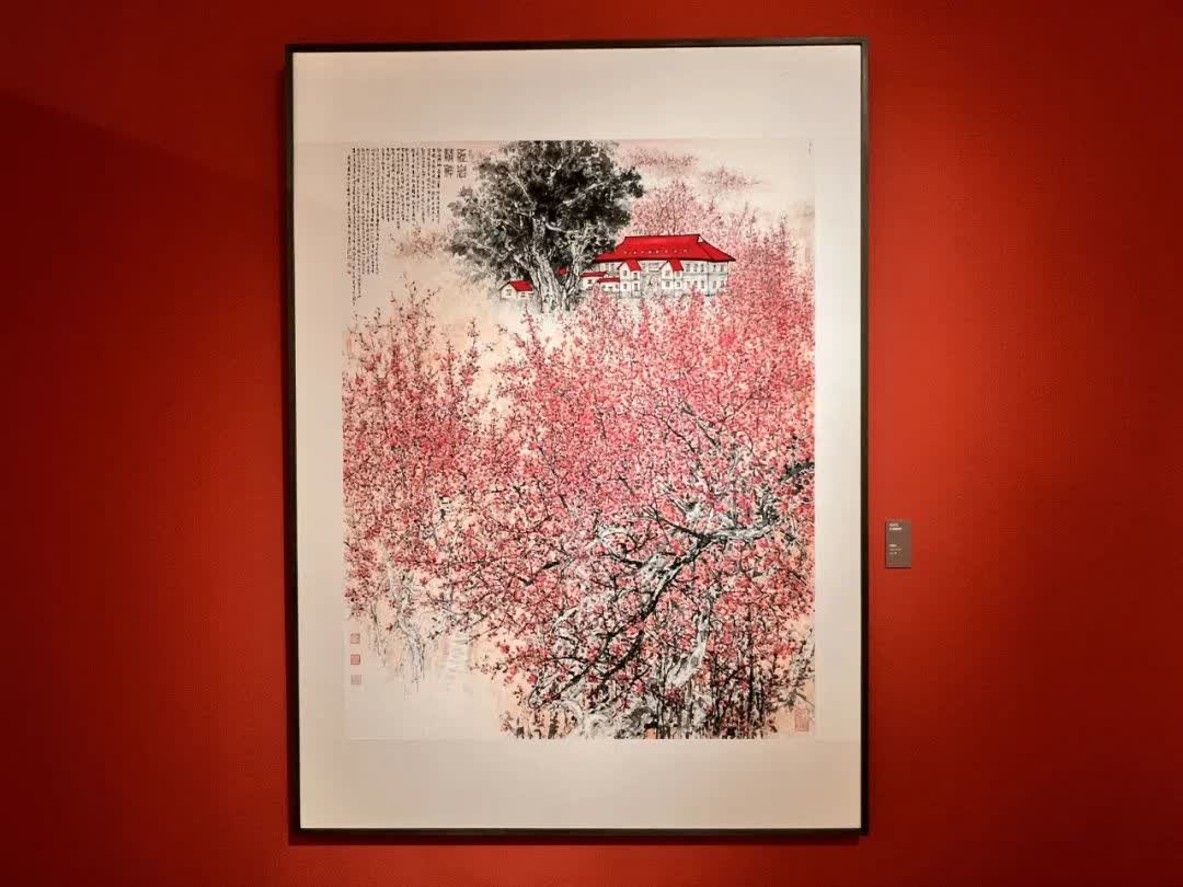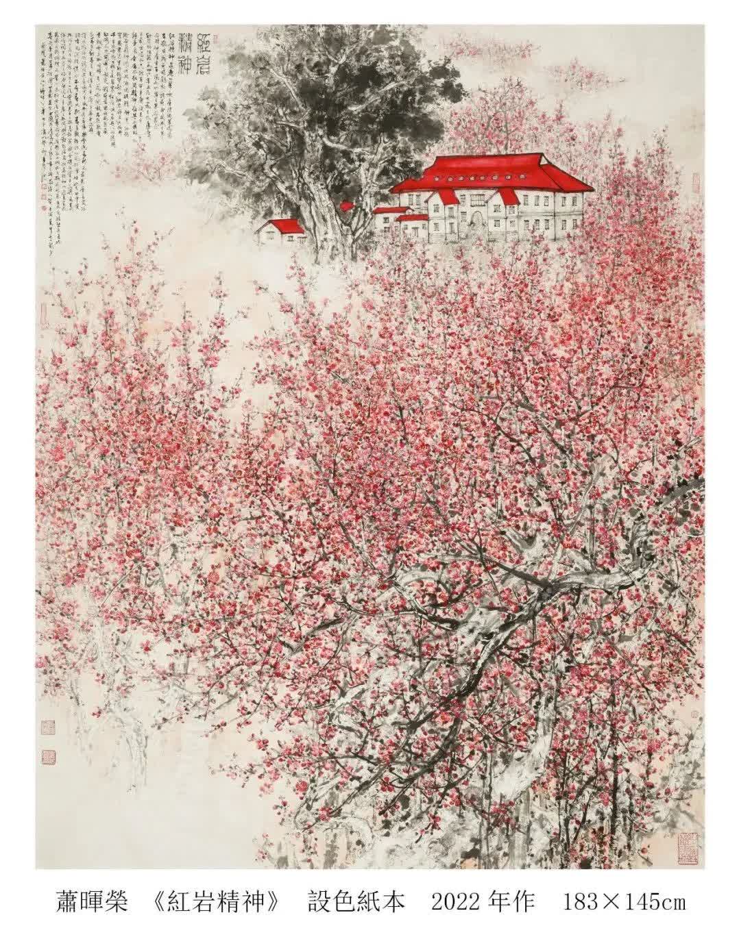 紅岩精神歷經八十餘年的歲月,依然閃爍着不朽的光輝,值得當代人學習借鑒。傳承紅色基因,弘揚革命精神是時代所賦予的偉大使命,也是文藝工作者的創作源泉。蕭暉榮教授秉持愛國精神,以其精品力作《紅岩精神》參加第十三屆中國藝術節優秀美術作品展覽。蕭教授之紅梅圖,以「紅岩上紅梅開」為主題,歌頌了革命前輩的奮鬥精神和頑強意志,是一篇梅花的禮讚,更是一份愛國誓言。作品中引用了毛澤東主席的詩詞:「待到山花爛漫時,她在叢中笑。」熱烈的紅梅充盈於畫面中,既浪漫又開懷,獨具個人風格,展現出積極樂觀的革命主義精神,借梅花的繁茂景象譬喻今日民族崛起,國家興盛的和諧盛世,予人以強烈的視覺衝擊與豐富的情感體驗。