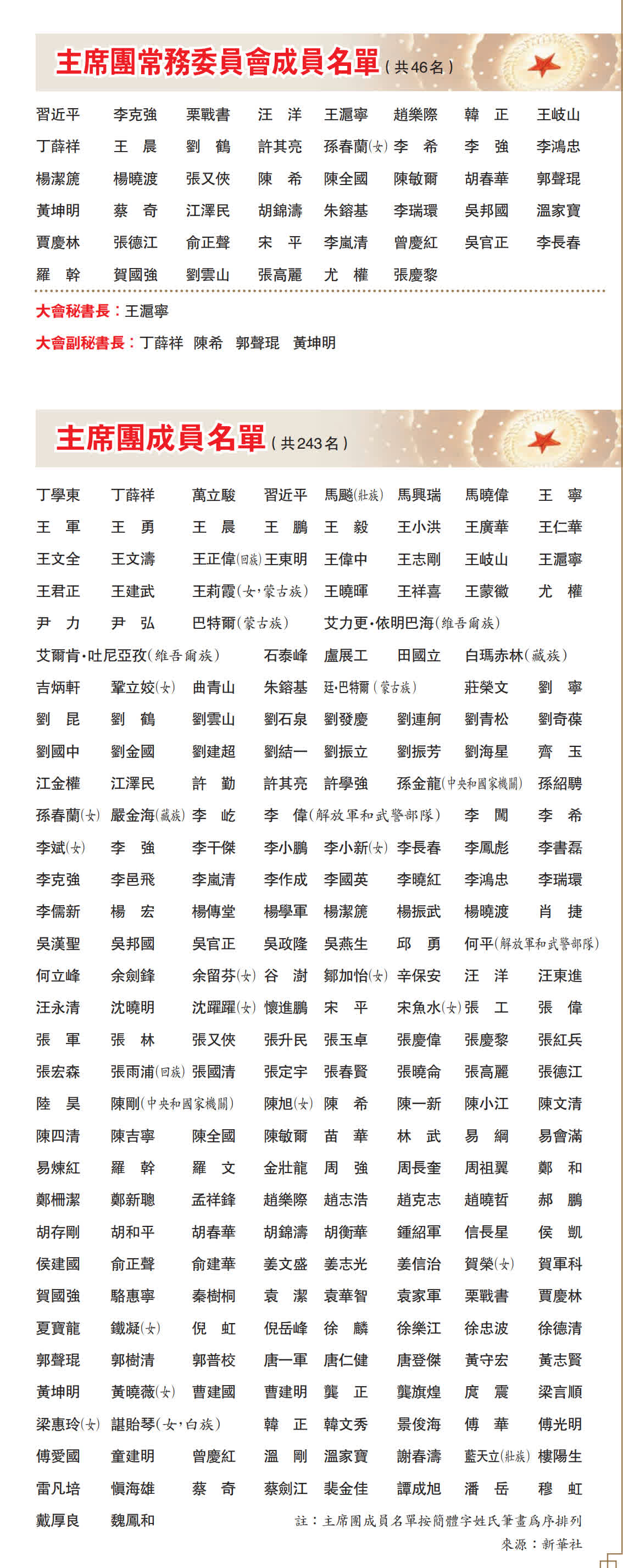 會議首先在大會秘書長王滬寧主持下,以舉手表決方式通過了由習近平同志等46人組成的主席團常務委員會名單。