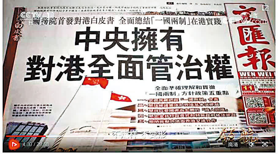 專題片並引用《大公報》和香港《文匯報》的報道版面指出,憲法、基本法共構香港憲制基礎,中央擁有對港全面管治權。專題片強調,「一國」是根,根深才能葉茂;「一國」是本,本固才能枝榮。十年來,香港背靠祖國、聯通世界、益以新創,不斷塑造自己的現代化風貌,「一國兩制」實踐取得了舉世公認的成功。