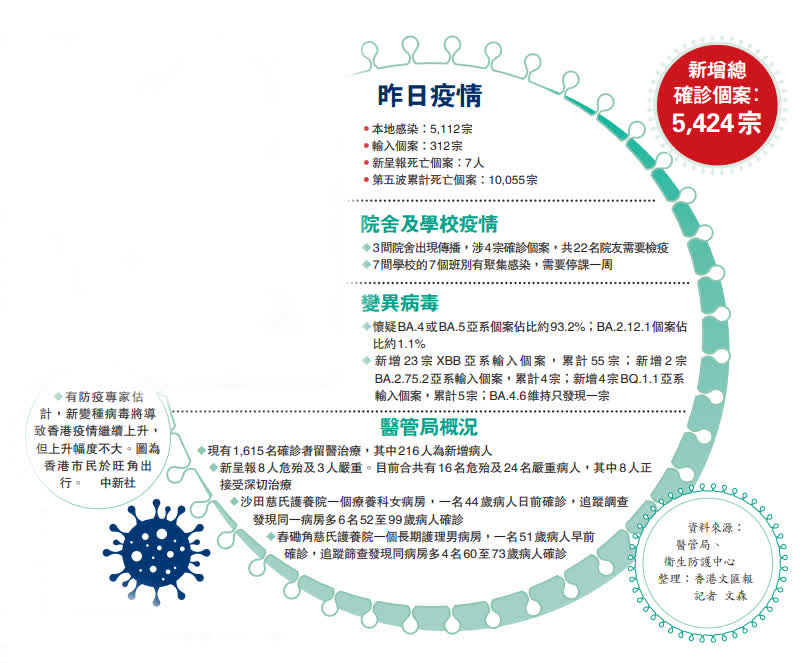 (香港文匯報 記者 文森)香港昨日新增5,424宗新冠肺炎確診個案,連續三天單日個案超過五千宗,新變異病毒個案愈揪愈多。香港昨日再發現23宗引發新加坡近期疫情大反彈的XBB亞系病毒株的輸入個案,累計55宗。至於前日首次在香港發現的BQ.1.1亞系病毒,昨日再新增4宗,累計5宗。BQ.1.1目前在英、美等地快速增加,繁殖速度比BA.5快三成,引起二次感染的風險也較高。有防疫專家估計,新變種病毒將導致香港疫情繼續上升,但上升幅度不大,因為這些變異病毒都是BA.2和BA.5的分支,港人已有相當高的混合免疫力,且絕大多數是輕症,惟擔心「撞正」流感高峰拖垮醫療系統,呼籲市民盡早接種新冠及流感疫苗。