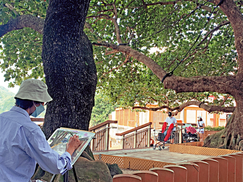 在記者經過期間,不少人圍坐在欖仁樹旁,打開畫板寫生。在他們的畫紙上,描繪出不同角度、不同形態的欖仁樹,而背後的藍天卻是出奇的一致。當然,也有畫者選擇將欖仁樹與八間屋收錄在一幅畫之中,畫面中多層次的綠色令人賞心悅目。除了寫生,八間屋前更是消閒休憩的場所。無論是遛狗還是帶小孩出門,不少家長選擇在欖仁樹前的陰涼處稍作停留。每當風吹過,欖仁樹的沙沙聲在耳邊回響,行人們在陰涼處一邊乘涼,一邊聊天,度過閒適午後。