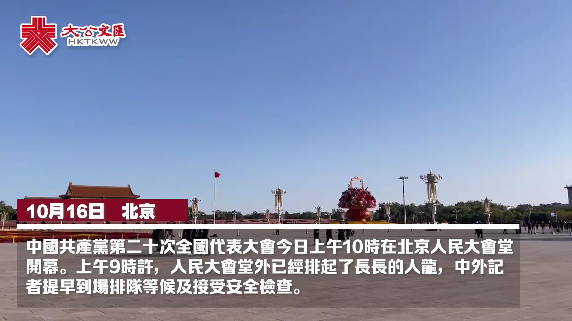 大公文匯全媒體報道,中國共產黨第二十次全國代表大會今日(16日)上午10時在北京人民大會堂開幕。上午9時許,人民大會堂外已經排起了長長的人龍,中外記者提早到場排隊等候及接受安全檢查。時隔5年再次採訪全國黨代會,不少記者心情興奮,紛紛在大會堂前合影留念。