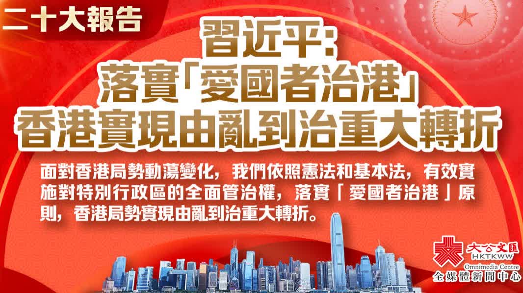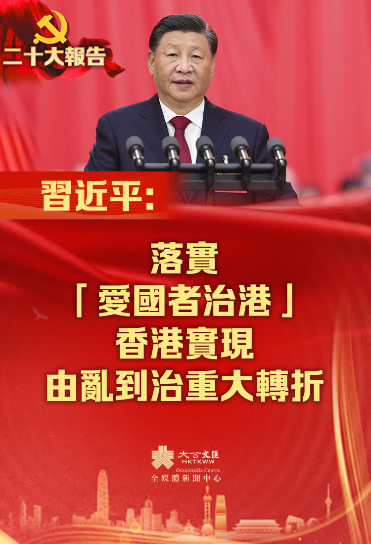 大公文匯全媒體報道,中國共產黨第二十次全國代表大會今日(16日)上午10時在北京人民大會堂開幕,習近平代表中共第十九屆中央委員會向大會作報告。習近平在報告中指出,面對香港局勢動蕩變化,我們依照憲法和基本法,有效實施對特別行政區的全面管治權,落實「愛國者治港」原則,香港局勢實現由亂到治重大轉折。