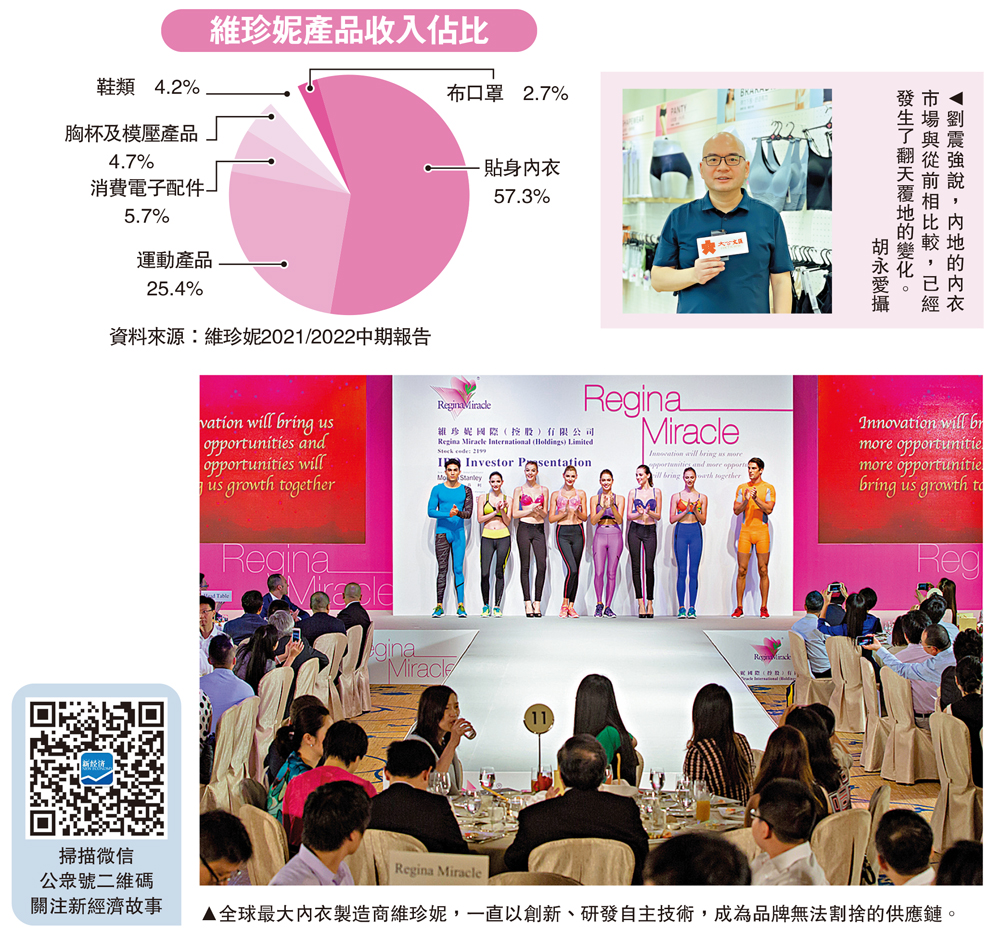 (大公報 記者 胡永愛)疫情肆虐全球三年,同時歐美持續高通脹,消費意欲急速下滑,內衣代工行業經歷了兩次大洗牌。全球最大內衣製造商維珍妮(02199),以創新、研發自主技術,成為品牌無法割捨的供應鏈。維珍妮研發及設計總監兼執行董事劉震強強調,海外客戶怕失去核心供應鏈,設法保住維珍妮,但求人不如求己,在觀察市場及產品變化後,把重心轉到內地市場,且與內地電商品牌合作推出多元產品,迎難而上。