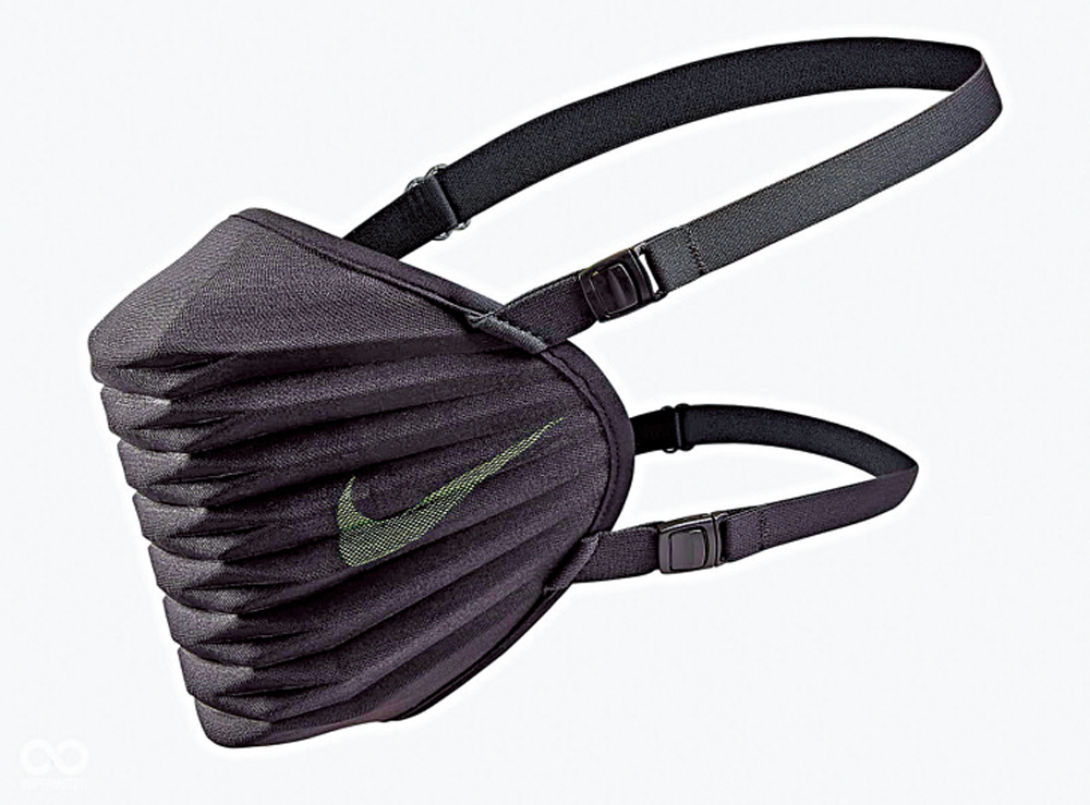 耐克這款口罩專門為運動員設計,布料硬挺、褶皺有序交錯,整體黑色、酷炫有型。在疫情常態化防控之下,它不僅具備一定防護作用,且不易滑落、給運動員口鼻留有足夠的呼吸空氣。當年一經亮相,就大受運動員及大眾消費者歡迎、立馬售罄缺貨。