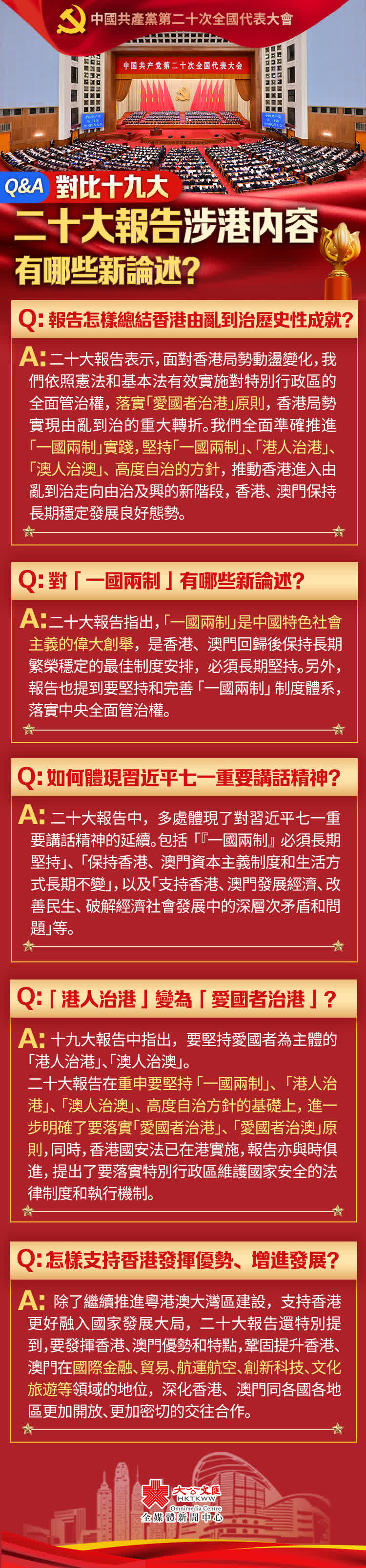 A:二十大報告指出,「一國兩制」是中國特色社會主義的偉大創舉,是香港、澳門回歸後保持長期繁榮穩定的最佳制度安排,必須長期堅持。另外,報告也提到要堅持和完善「一國兩制」制度體系,落實中央全面管治權。