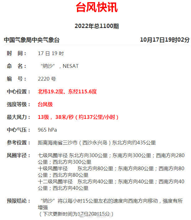 據央視新聞報道,10月17日,廣東省氣象台預計,受冷空氣和今年第20號颱風「納沙」外圍疊加影響,10月18日—19日廣東省海面和南海將持續有大風,18日—21日,廣東省中北部市縣日平均氣溫下降4℃~6℃,南部下降6℃~8℃,並伴有6級~8級陣風,其中19日—20日,粵西市縣有大雨到暴雨局部大暴雨。10月18日—20日廣東省大部有寒露風,注意其對農業的影響。氣溫變化大,民眾注意適時添減衣物。