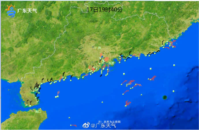 18日—19日:南海中北部海面、台灣海峽東北風10級~11級、陣風12~13級,廣東省中東部海面、巴士海峽東北風8級~10級、陣風11級~12級,颱風中心經過的附近海面旋轉風12~14級、陣風15級,廣東省西部海面、北部灣海面、瓊州海峽東北風7級~9級,陣風10級~11級,珠江口內河面偏北風7級,陣風8級~9級。