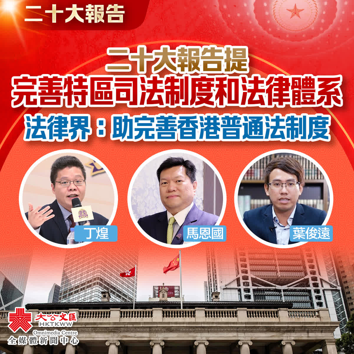 全國港澳研究會會員、香港法學交流基金會副主席丁煌表示,在過去短短數十年間,我國創造了人類歷史奇跡,完成脫貧攻堅、全面建成小康社會的歷史任務。脫貧之餘,更進取的目標就是共同富裕。强國之餘,必先保護領土完整,所以,提速內地與台灣統一乃强國道路上的重中之重。二十大報告提及「完善特別行政區司法制度和法律體系」,丁煌指出,憲法是國家最高的法律,作為中華人民共和國的特別行政區,香港的司法制度在憲法的大框架內,司法界必須在正確執行基本法的同時,堅守憲法在保護國家安全與領土完整方面的法律規定。