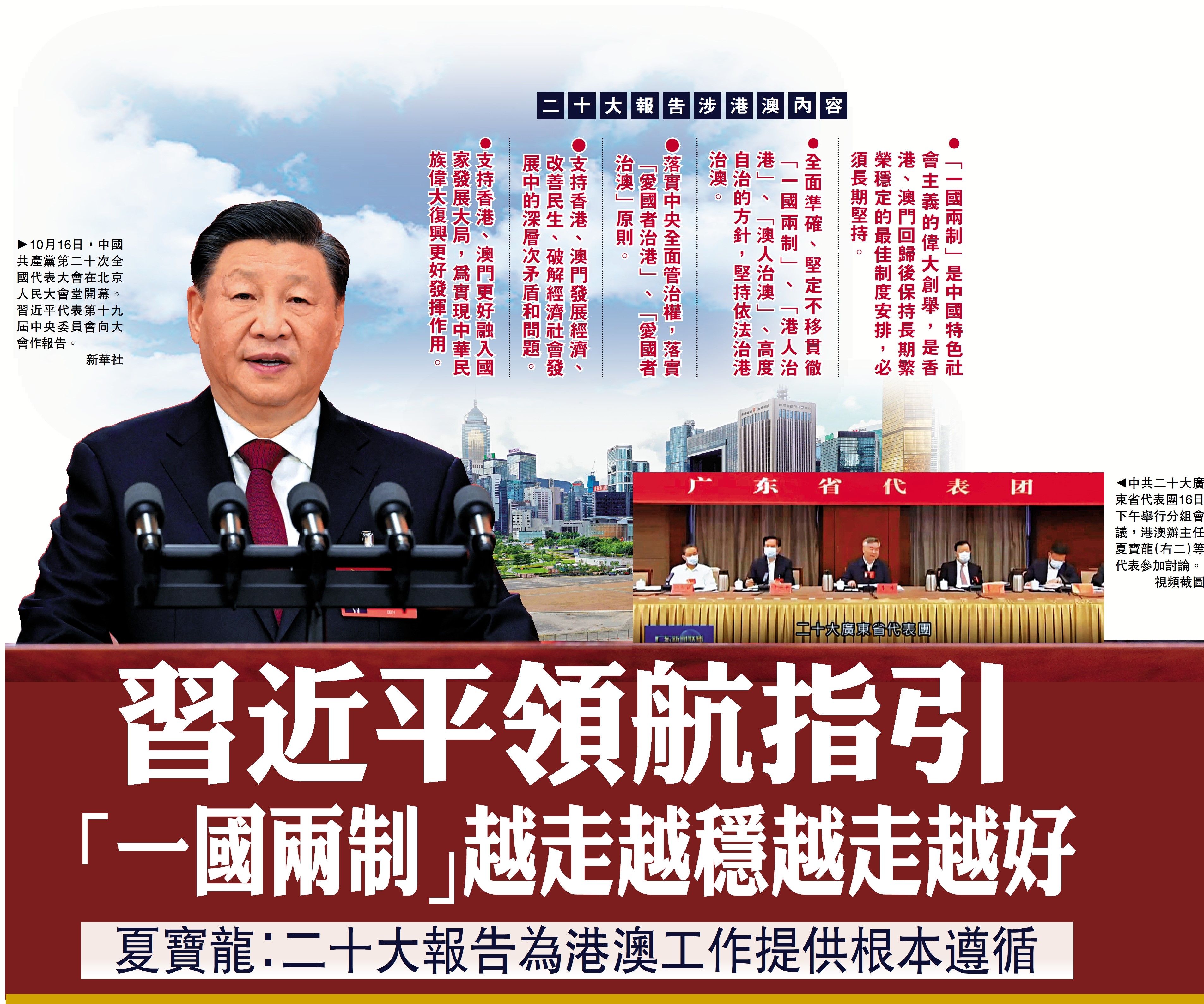 (大公報記者龔學鳴、李清)習近平在二十大報告中闡述了過去五年的工作和新時代十年的偉大變革。全國政協副主席、港澳辦主任夏寶龍在廣東省代表團分組會議討論時說,報告系統闡述堅持和完善「一國兩制」的新理念新思想新戰略,為做好港澳工作提供了根本遵循和行動指南。有習近平新時代中國特色社會主義思想科學指引,「一國兩制」事業一定能夠越走越穩、越走越好。