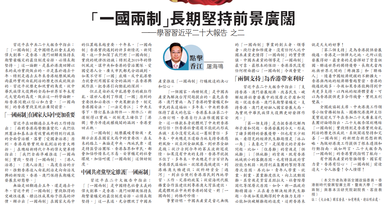習近平在二十大報告中指出:「『一國兩制』是中國特色社會主義的偉大創舉,是香港、澳門回歸後保持長期繁榮穩定的最佳制度安排,必須長期堅持。」這一表述,充分體現了中國共產黨推進「一國兩制」行穩致遠的決心和信心。