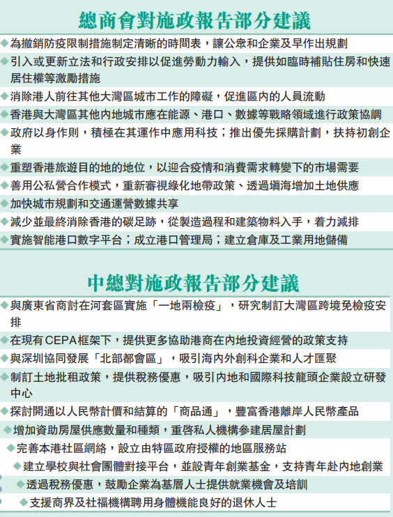 至於零售業方面,總商會建議特區政府資助零售業和旅遊業的中小企實施電子亭和採用電子支付服務;通過直接補貼計劃和配套贈款等方式,專門為受到政府強制限制直接或間接影響的旅遊和餐飲(F&B)經營者、表演者等行業和個人提供財政支持;引進創新科技,資助研發項目,打造科技樞紐以支持香港的活動業;打造一站式數字信息平台,為遊客提供最新的旅遊、餐飲、娛樂信息,以及商家的全市促銷優惠等。