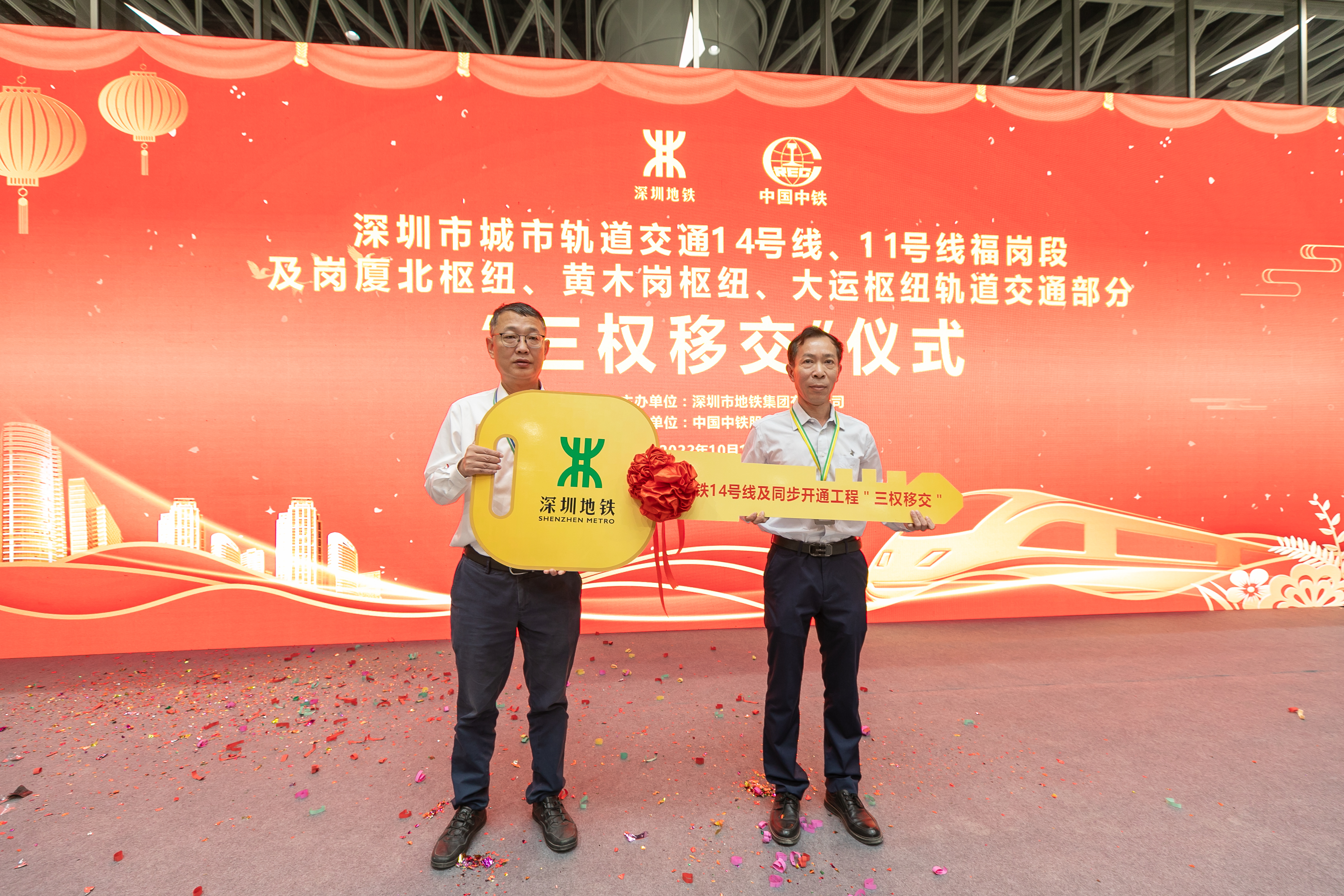 (大公文匯網記者 郭若溪)10月18日,深圳市城市軌道交通四期工程「兩線三樞紐」三權移交儀式在崗廈北樞紐順利舉行。深鐵建設負責人代表將「金鑰匙」傳遞到深鐵運營負責人手中,標誌着深圳地鐵14號線、11號線福田-崗廈北區間及崗廈北樞紐、黃木崗樞紐、大運樞紐正式由建設階段轉為運營籌備階段,計劃月底前開通初期運營,屆時全網將增加3座換乘站點。