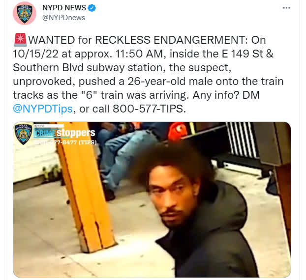 紐約警方16日公布了現場錄影以通緝嫌疑人。該事件發生之際,紐約地鐵系統的犯罪率達到新高,紐約市長此前承諾會增加警力,但犯罪事件還是一再發生,不少乘客對安全問題表達了擔憂。