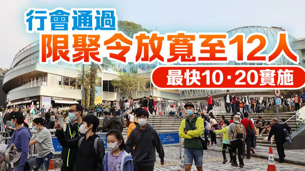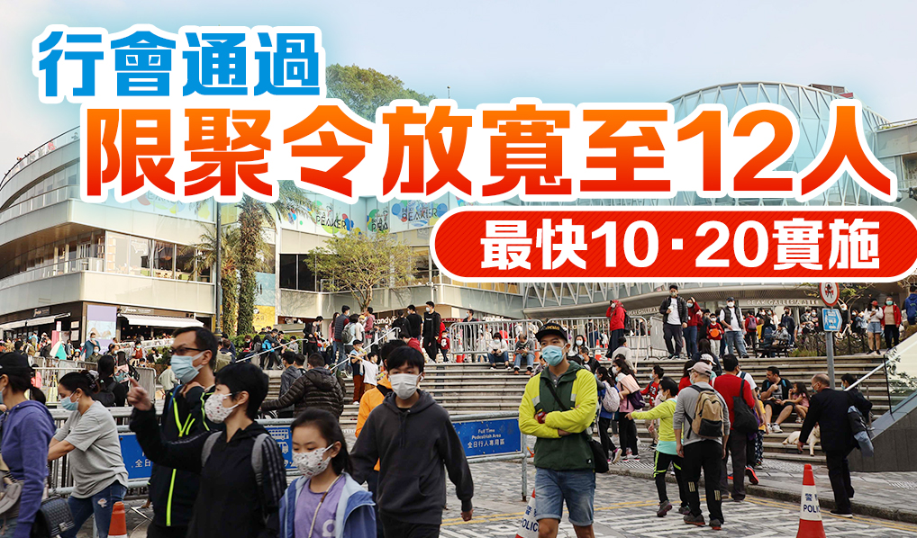 大公文匯全媒體報道,政府今日(18日)公布,行政長官會同行政會議已經批准對《預防及控制疾病(禁止聚集)規例》(第599G章)作出修訂,把在公眾地方進行的群組聚集的人數上限由4人增加至12人。有關修訂將會按「先訂立、後審議」程序由立法會審議,並於10月20日起生效,以配合早前政府公布將作適度放寬的社交距離措施生效周期(即10月20日至11月2日)。