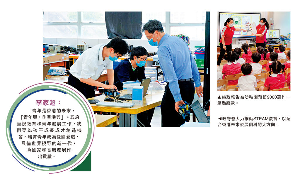 (大公報 記者 張凱晴)行政長官李家超發表任內第一份施政報告,在教育範疇有七大發展方向。其中教育局將大力推動中小學發展STEAM教育及國民教育,以回應二十大會議中國家主席習近平要香港發展創科。此外,更預留9000萬供幼稚園作一筆過撥款,以緩解疫下運營難的問題。教聯會認為,有關措施建構了今屆政府對教育發展的願景,反映了對教育的重視,亦呼應了二十大報告中提到「辦好人民滿意的教育」、「落實立德樹人根本任務」的精神。