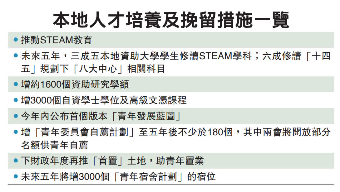 行政長官李家超發表任內首份施政報告,在本地人才方面,他提及香港在疫情下流失約14萬勞動人口,因此令本地人才選擇留港是非常重要。報告中提及「青年發展藍圖」進度,並以「青年委員會自薦計劃」增加青年議政的機會。此外,青年住宿計劃將擴增至3000個宿位,料會租用旅館房間作為新宿舍。