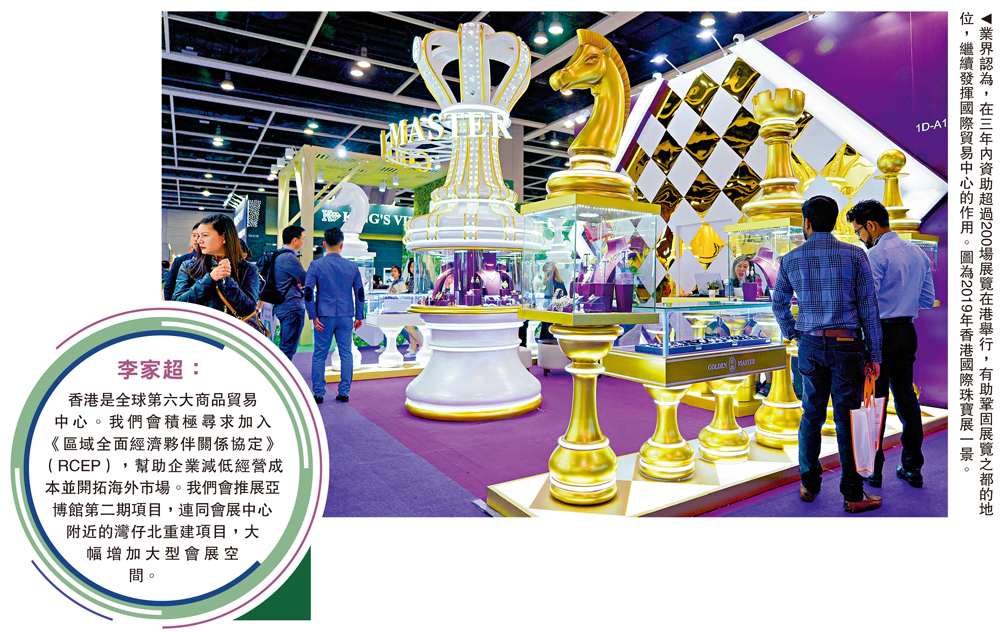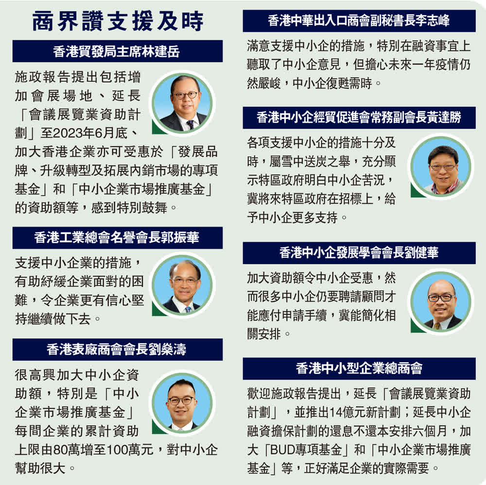 (大公報 記者 李永青)為協助中小企增加海外訂單,行政長官李家超在首份施政報告中提出,將着力支持會展業,延長「會議展覽業資助計劃」至明年6月底,隨後更會推出14億元新計劃,在三年內資助超過200場展覽在港舉行,並提出四項支援措施,包括:加大資助額、把握內地機遇、延長「還息不還本」安排,以及延長特區政府費用寬減。商會歡迎有關建議,認為能針對中小企當前困局,發揮「及時雨」的作用。同時,積極尋求加入《區域全面經濟夥伴關係協定》(RCEP),因為有助企業減低經營成本並開拓海外市場。