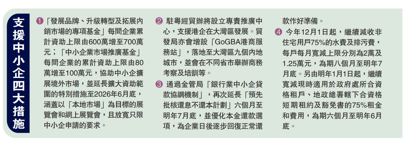 施政報告同時提出四大支援中小企措施。首先是加大資助額,「發展品牌、升級轉型及拓展內銷市場的專項基金」每間企業累計資助上限由600萬增至700萬元;「中小企業市場推廣基金」每間企業的累計資助上限由80萬增至100萬元,協助中小企擴展境外市場,並延長擴大資助範圍的特別措施至2026年6月底,涵蓋以「本地市場」為目標的展覽會和網上展覽會,並放寬只限中小企申請的要求。