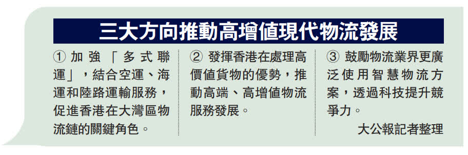 李家超還指出,將會於今年內開展與香港物流發展局及業界攜手制訂推動高增值現代物流發展的行動綱領,主要涉及三大方向,一是加強「多式聯運」,結合空運、海運和陸路運輸服務,促進香港在大灣區物流鏈的關鍵角色;二是發揮香港在處理高價值貨物的優勢,推動高端、高增值物流服務的發展,例如冷鏈貨物、鮮活食品、藥品等;三是鼓勵物流業界更廣泛使用智慧物流方案,透過科技提升競爭力。