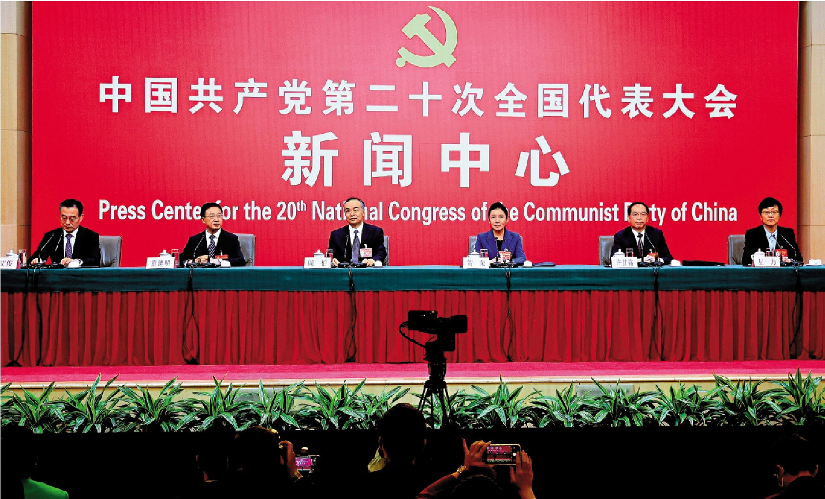 10月19日,中共二十大記者招待會新聞中心舉行記者招待會。中央政法委副秘書長誾柏,最高人民法院黨組副書記、分管日常工作的副院長、一級大法官賀榮,最高人民檢察院黨組副書記、分管日常工作的副檢察長、一級大檢察官童建明,公安部黨委委員、副部長、國家移民管理局黨組書記、局長許甘露,司法部黨組成員、副部長左力圍繞「堅持以習近平法治思想為指引 努力建設更高水平的法治中國」主題與記者交流。