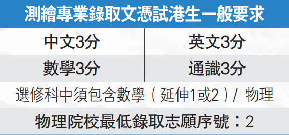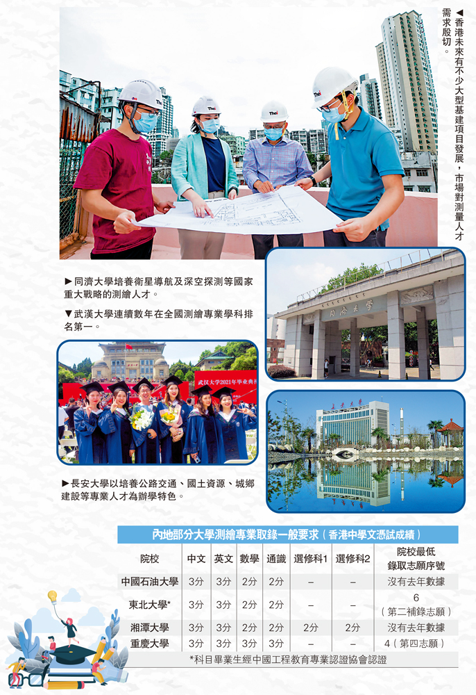 不過,香港的測量本科學位課程很少,只有三所大學有開辦,而且每所院校收生都不足50人,同學想要更多測量專業的升學選擇,可以放眼祖國。內地高校測繪課程範圍很廣,以內地測繪專業學科排名第一的武漢大學為例,課程包括有遙感測量,至於同濟大學在深空探測等領域亦見突出。