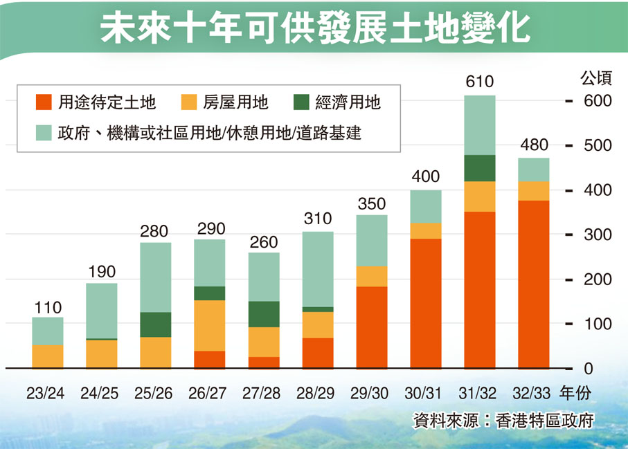 數據顯示,未來10年可供發展土地供應量呈逐年上升趨勢,由首年的110公頃,至第九年的610公頃。這10年間的供應來源主要是新區的開發,初期集中於東涌新市鎮擴展,之後「北部都會區」的古洞北、粉嶺北、洪水橋/厦村、元朗南及新田/落馬洲等新發展區會接力成為主要來源,在中後期交椅洲人工島填海及將軍澳第137區亦有「熟地」出現。