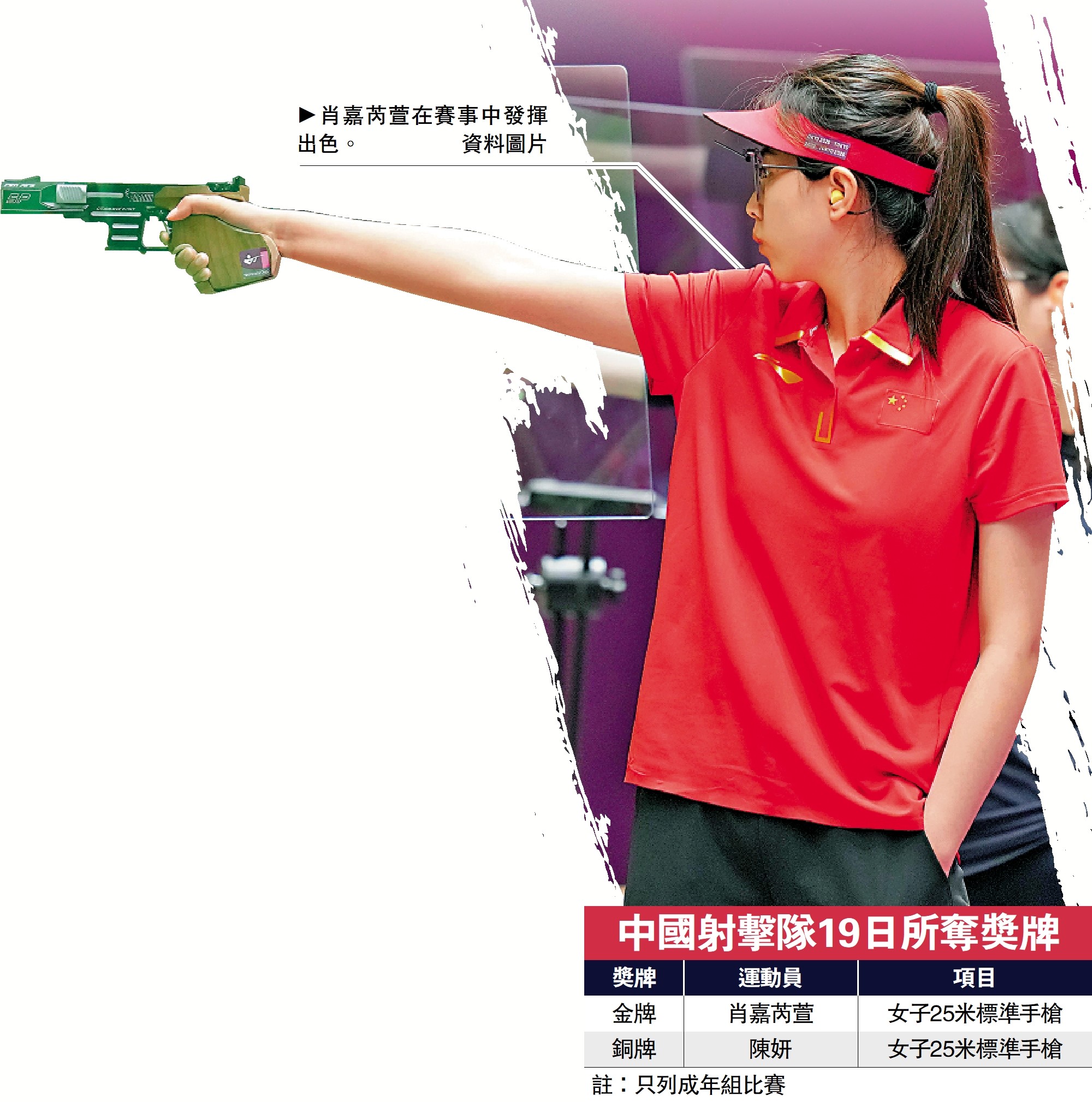 大公報援引新華社報道:國際射擊運動聯合會官網消息,在埃及開羅當地時間19日進行的射擊(步手槍)世界錦標賽比賽中,中國隊收穫2金2銀2銅。肖嘉芮萱奪得女子25米標準手槍冠軍,中國還包攬青年組男子10米氣步槍前三名。