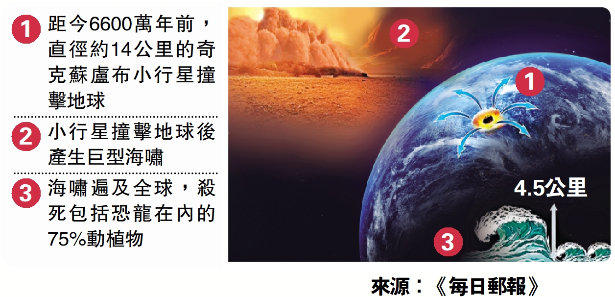 大公報綜合《華盛頓郵報》、《紐約時報》、CNN報道:科學界普遍認為,6600萬年前1顆直徑約14公里的小行星撞擊了地球,導致包括恐龍在內的超過75%動植物滅絕。密歇根大學科學團隊使用模型分析出當時小行星撞擊地球所引發的海嘯威力,發現小行星撞擊後,產生4.5公里高的波浪,衝向四面八方,全球都受到海嘯的波及。