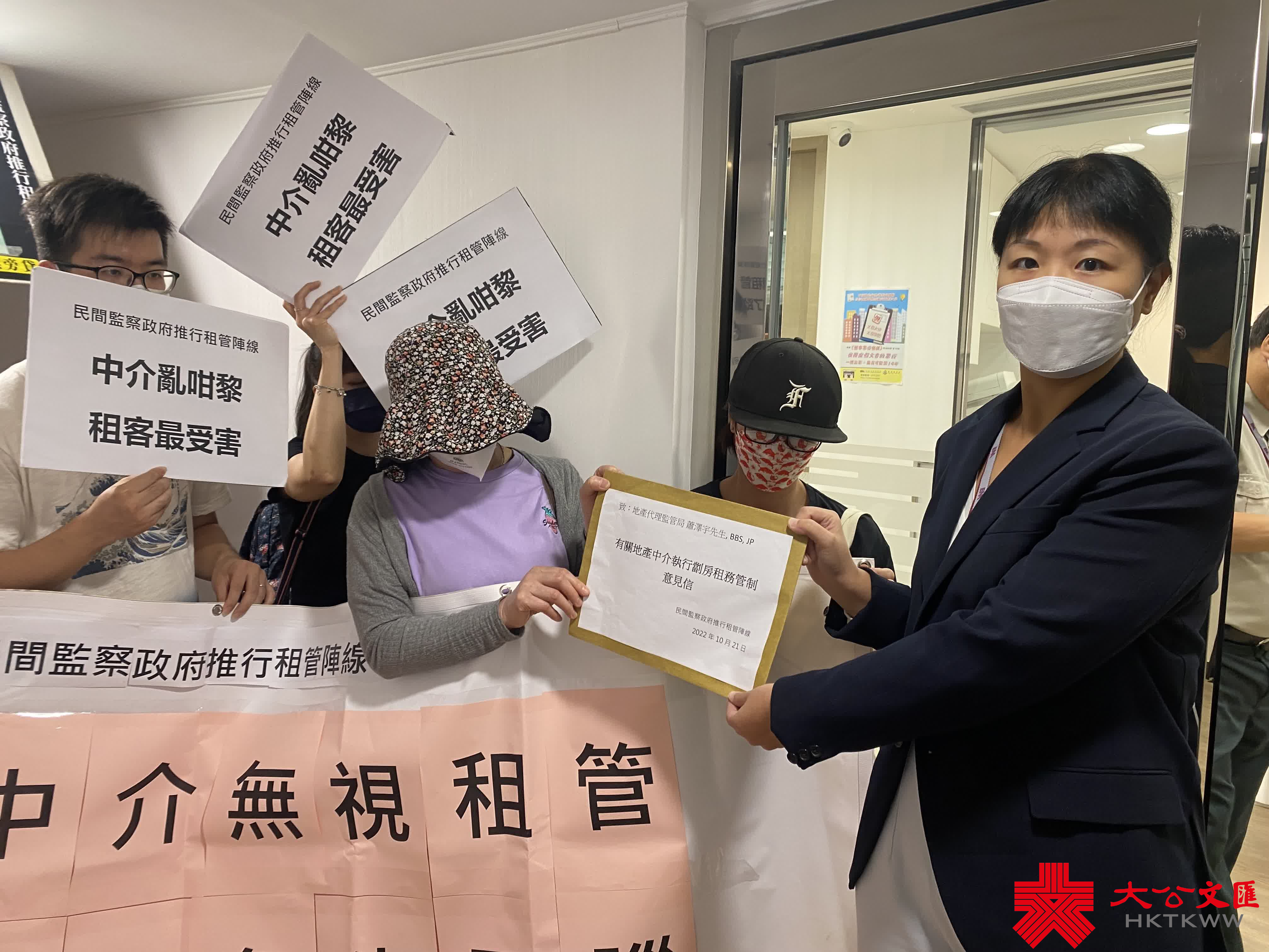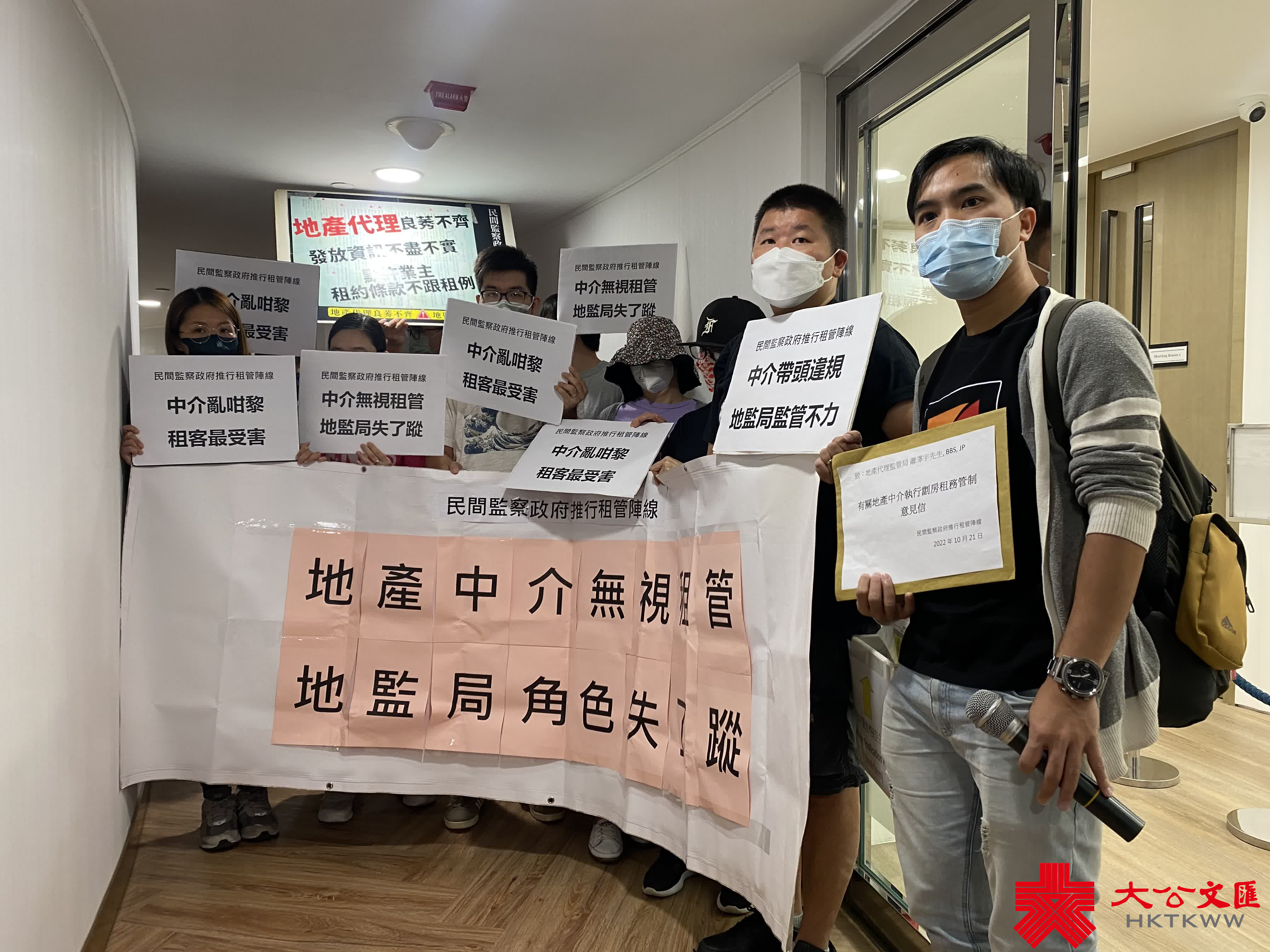 (大公文匯全媒體 記者 嚴璐瑶)由觀塘、葵涌及荃灣區的街坊代表組成的民間監察政府推行租管條例團體於今日(21日)進行請願,反映地產中介監督不力問題。不少劏房戶反映地產中介在「劏房租管限制」實施後未有依例執行,繼續鼓勵業主濫收水電費及其他雜費等,亦未有使用差估署提供的「標準租約」及打釐印,甚至未有租约等。