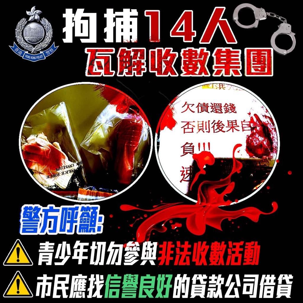大公文匯全媒體報道,警方屯門警區刑事部於2022年9月至10月展開代號「所羅門」的反非法收數行動,其間以「以過高利率放債」、「刑事恐嚇」、「刑事毀壞」、「襲擊致造成身體傷害」等罪拘捕8男6女,年齡介乎18至50歲,並檢獲多張收數字條、手套、紅油罐、多部手提電話及一批衣物,他們涉嫌與區內10宗非法收債案件有關,其中2人更報稱學生,部分人有黑社會背景。警方相信已成功瓦解一個活躍於屯門區的收數集團。