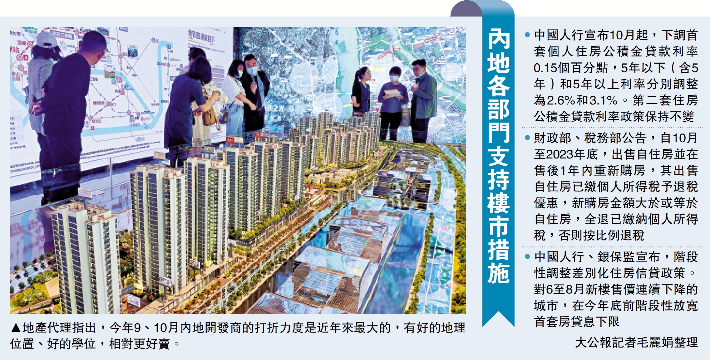 (大公報 記者 毛麗娟、倪巍晨)內地開始新一輪樓市刺激新政,加上開發商進一步加大優惠力度,帶動市民購房意欲逐漸增強,經紀帶客看盤量有所增多。分析指出,樓市已開始改善,隨着政策持續優化,開發商加快房源去化,市場有望轉趨活躍。預期第四季度房地產政策將維持相對寬鬆的基調,房地產價格可望觸底企穩。