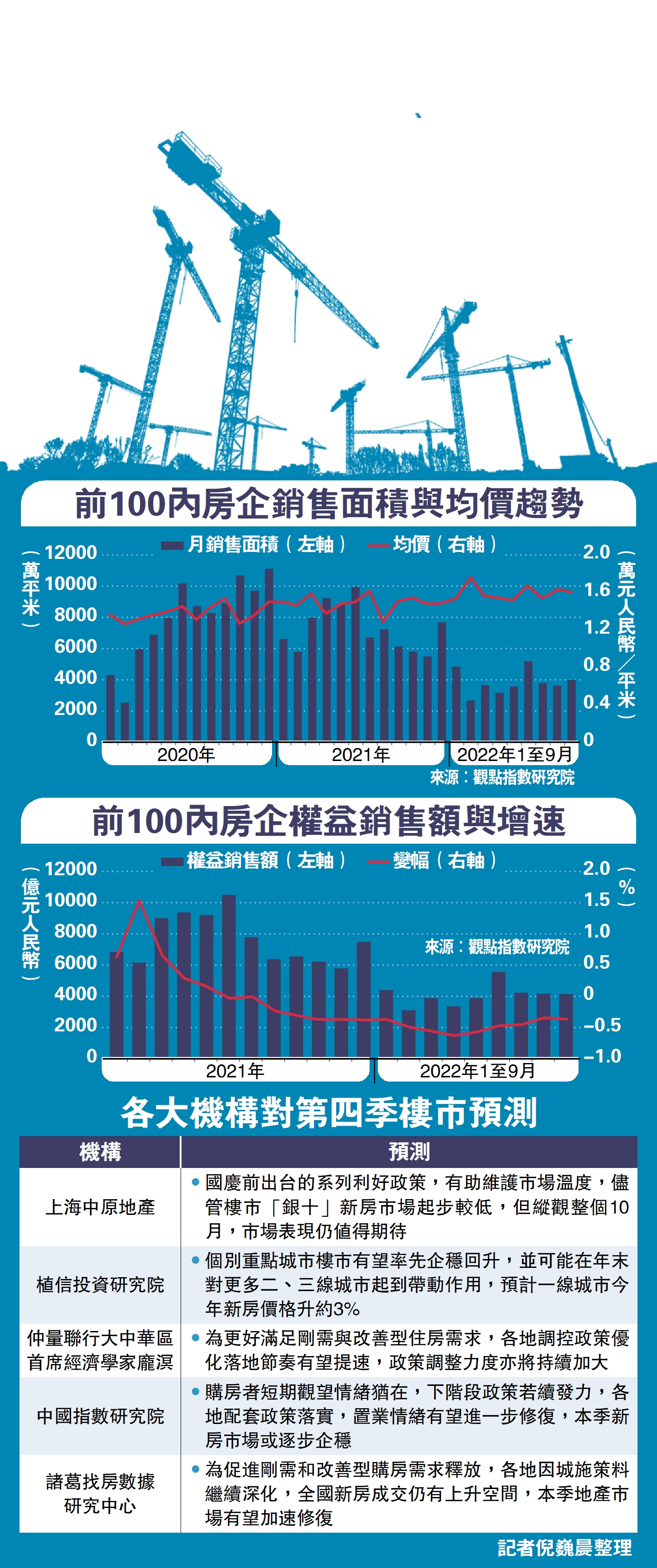 植信投資研究院首席經濟學家連平坦言,四季度房地產政策有望延續相對寬鬆的基調,大部分城市將繼續圍繞公積金、住房補貼、購房首付比例等政策工具,為滿足剛需和改善型住房需求的釋放提供便利,預計住房金融環境將逐步回暖,房貸利率亦有小幅調降空間,不排除一些有條件的城市逐步取消限制性購房政策的可能性。他並指,在紓解房企壓力方面,地方政府料透過設立疏困基金、引入資產管理公司、借助政策性銀行專項借款等,更有力地推進「保交樓」。
