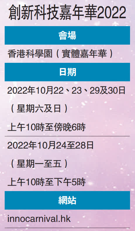 (大公報 記者 鍾怡)由創新科技署主辦的「創新科技嘉年華2022」昨日起至10月30日在科學園舉行。活動以「創科力量 夢想啟航」為主題,並以實體及線上模式舉行,包括在科學園實體展出多項本地創新發明和科研成果,並在線上舉行講座及工作坊。