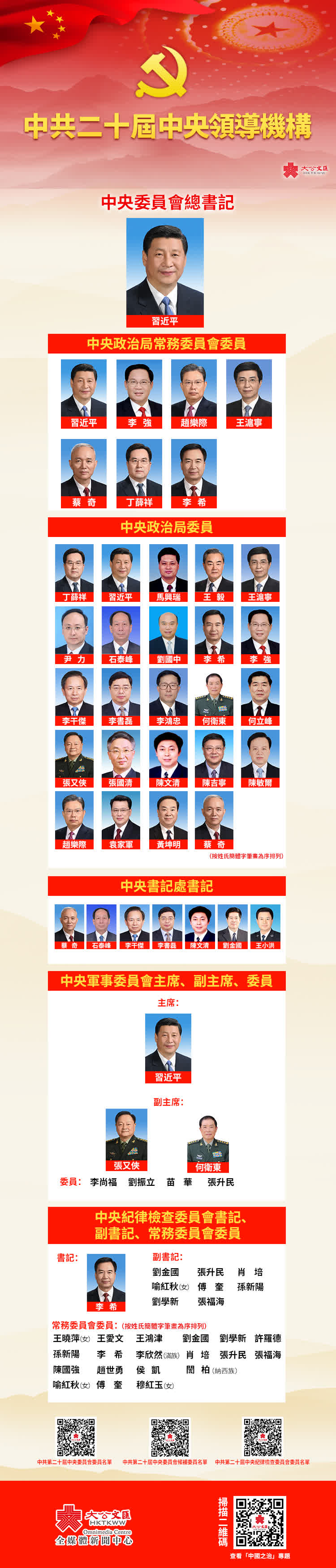 全會選舉了中央政治局委員、中央政治局常務委員會委員、中央委員會總書記;根據中央政治局常務委員會的提名,通過了中央書記處成員,決定了中央軍事委員會組成人員;批准了二十屆中央紀律檢查委員會第一次全體會議選舉產生的書記、副書記和常務委員會委員人選。快來一圖睇清中央領導機構成員!