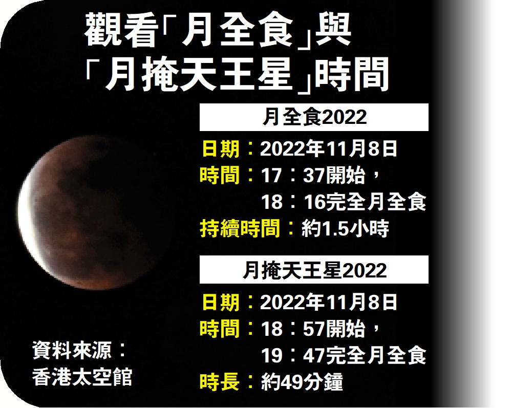 今次「血月」月全食將於香港時間2022年11月8日傍晚5時37分起開始,而「血月」的奇景將持續近1個半小時,月亮於傍晚6時16分完全進入地球本影,隨後的月偏食則會在晚上8時49分完結。太空館預計,下一次香港可觀測到的月全食,將在2025年9月8日發生;「月掩天王星」則預計在傍晚6時57分開始,至傍晚7時47分結束,全程歷時約49分鐘。