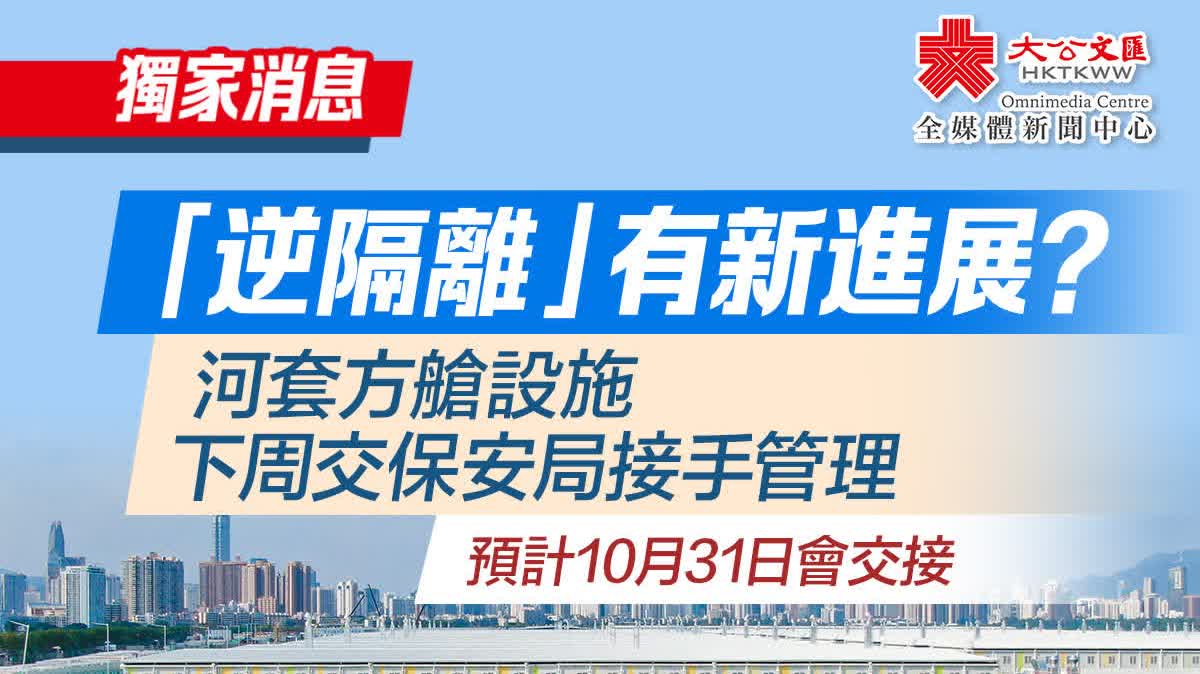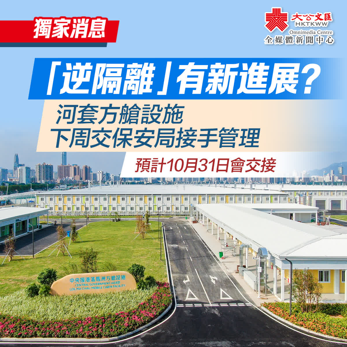大公文匯全媒體報道,政府早前公布推出「逆向隔離」方案,即香港赴內地人員先在香港隔離,再以閉環方式前往內地,初步考慮以河套區設施作「逆向隔離」試點。大公文匯全媒體今日(24日)從消息人士處獲悉,因為要準備把本港的方艙轉為「逆向隔離」設施,現時位於落馬洲河套區的方艙設施,下周將會交由保安局接手管理,預計下周一(31日)會交接。