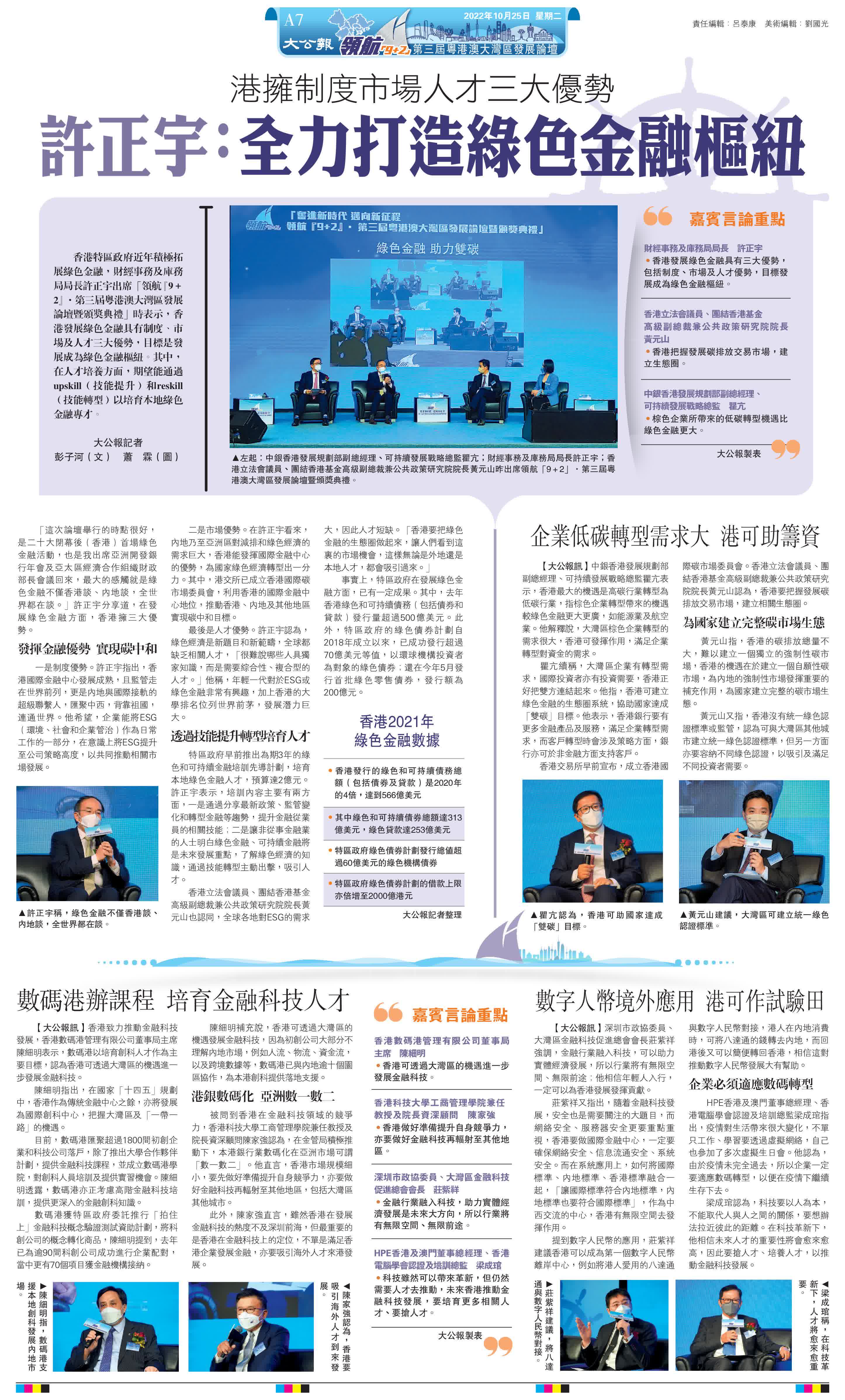 (大公報記者 彭子河<文> 蕭 霖<圖>)香港特區政府近年積極拓展綠色金融,財經事務及庫務局局長許正宇出席「領航『9+2』·第三屆粵港澳大灣區發展論壇暨頒獎典禮」時表示,香港發展綠色金融具有制度、市場及人才三大優勢,目標是發展成為綠色金融樞紐。其中,在人才培養方面,期望能通過upskill(技能提升)和reskill(技能轉型)以培育本地綠色金融專才。