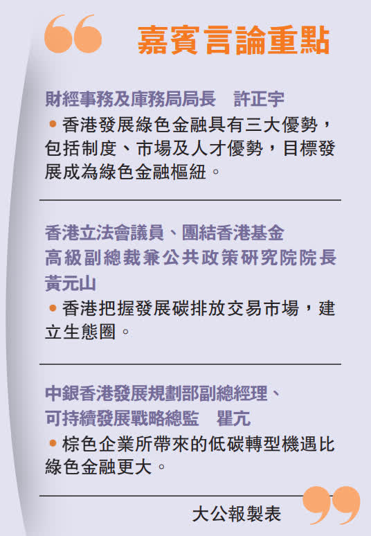 「這次論壇舉行的時點很好,是二十大閉幕後(香港)首場綠色金融活動,也是我出席亞洲開發銀行年會及亞太區經濟合作組織財政部長會議回來,最大的感觸就是綠色金融不僅香港談、內地談,全世界都在談。」許正宇分享道,在發展綠色金融方面,香港擁三大優勢。