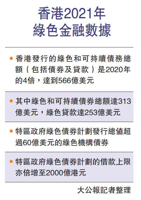 事實上,特區政府在發展綠色金融方面,已有一定成果。其中,去年香港綠色和可持續債務(包括債券和貸款)發行量超過500億美元。此外,特區政府的綠色債券計劃自2018年成立以來,已成功發行超過70億美元等值,以環球機構投資者為對象的綠色債券;還在今年5月發行首批綠色零售債券,發行額為200億元。