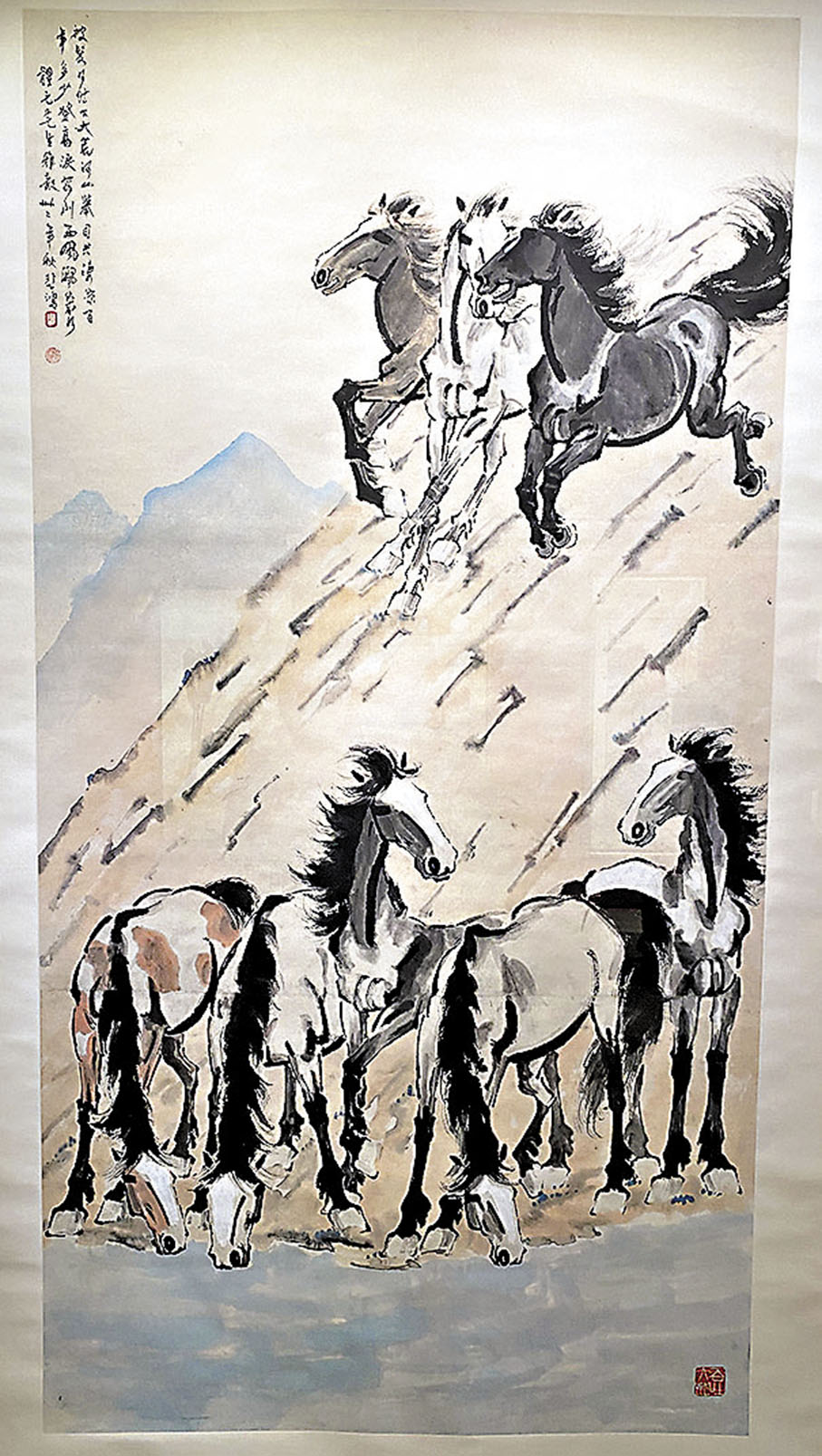 徐悲鴻以畫馬聞名,他筆下的駿馬時而激昂,時而飄逸,線條變化多樣,結合了中西畫的技法。《八駿圖》畫面充實且動靜相宜,八匹駿馬生氣勃勃。他通過深淺交疊的筆墨,刻畫出馬兒迎風飄逸的鬃毛,以及強壯結實的肌肉;他又運用光影的分布,突出駿馬豪邁瀟灑的性格。除了馬以外,牛亦是徐悲鴻喜畫的題材。在《耕牛圖》作品中的牛,眼神凌厲,身軀健碩。濃淡墨法並用,不僅刻畫了牛身凹凸的肌理,更顯出牛毛的質感。三頭牛或提蹄搔癢,或跨步前行,無不體現閒適的田園生活。