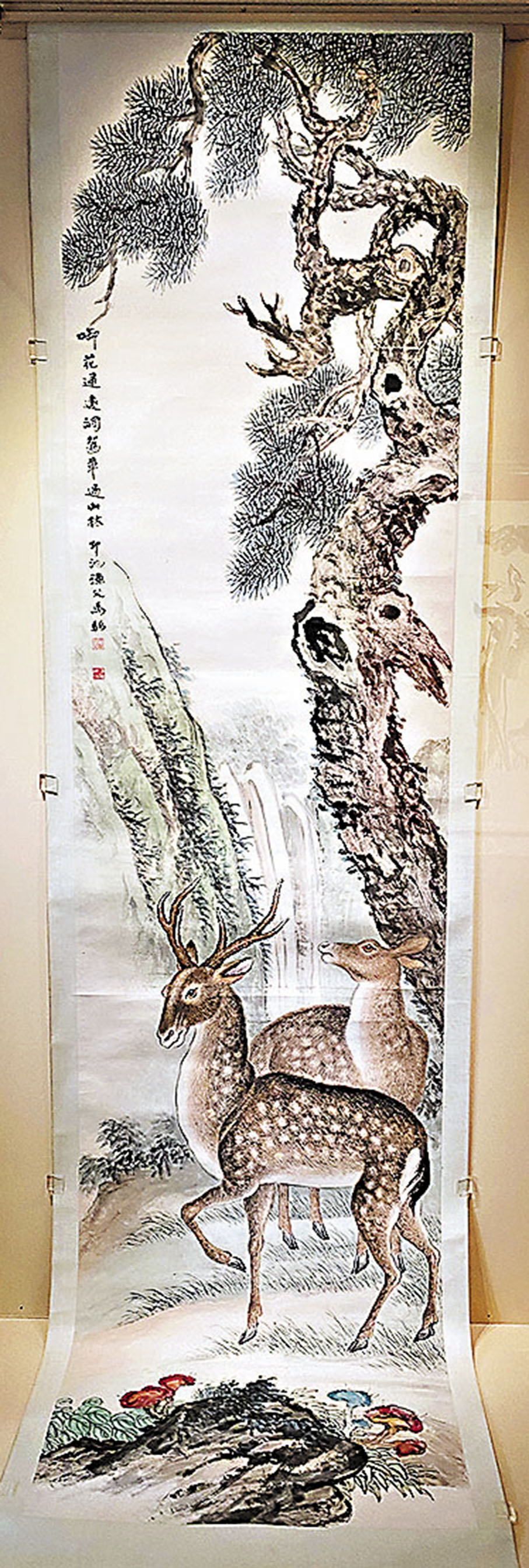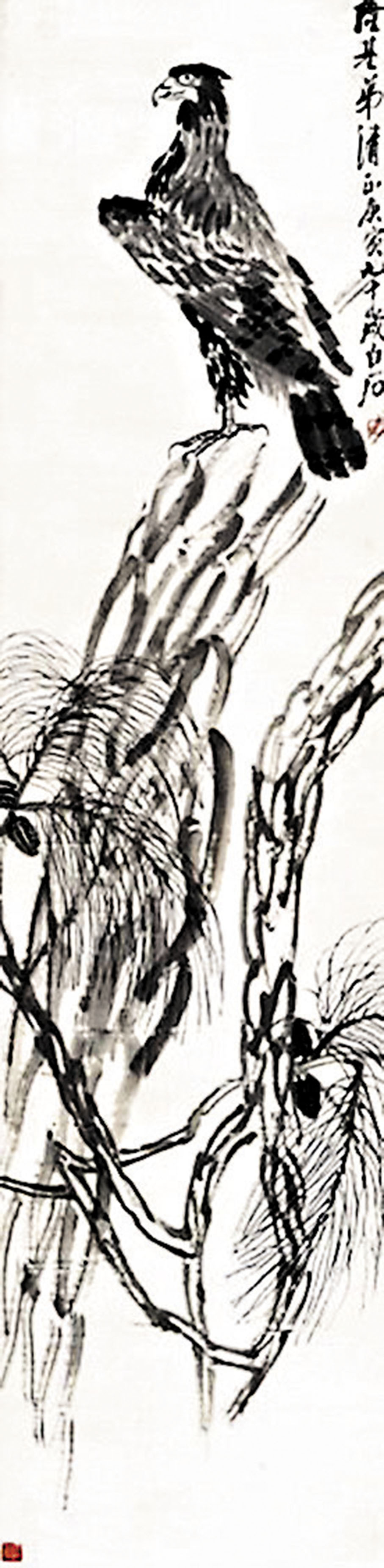 一新美術館助理館長謝鳳儀指,在水墨畫中經常以松樹和鷹這組合作主題,原來這有特別意思,「鷹和英雄的英音相近,而松樹的生命力很強,象徵長壽,因此松樹和鷹則寓意英雄長壽,這吉祥的寓意使它們經常入畫。」齊白石擅長用墨色渲染物件的層次,在此畫作中,松果也入畫,細心留意下會發現,松果、鷹眼、嘴和爪也是用深色顏料繪畫,可見齊白石特意在在啞色布料中凸顯層次。